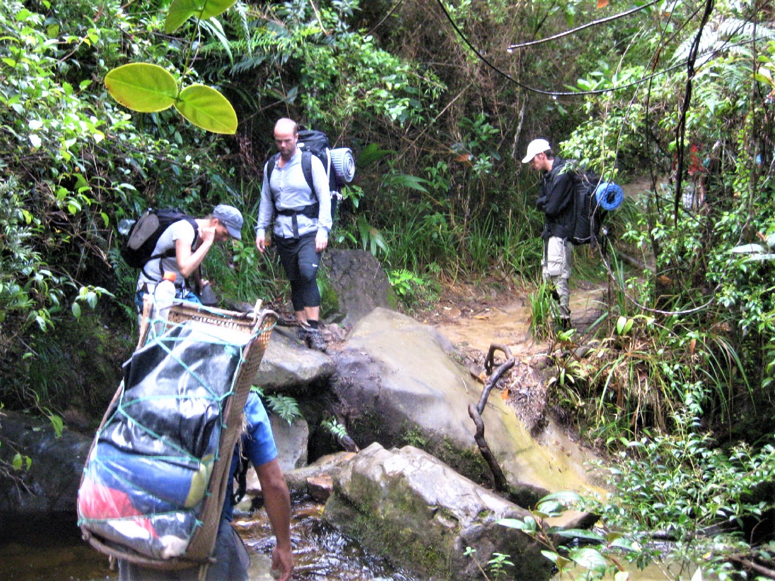 Uh, anyway, this trek. Yeah. So we set off for half a day of walking to Base Camp, starting the walk with two river crossings and a swim in River Kukenán. Heh, after all that effort to keep dry yesterday. The swim was lovely though, beautifully refreshing. The current is really strong, you feel it as soon as you get in and if you lose your footing or let go of the rocks you’ll be carried away. So of course we all just let ourselves be swept towards another set of rocks past a rather ominous cross hanging from a tree on the bank. Hmm. And that’s another thing I like about Venezuela; If you tried doing that in New Zealand or Australia you’d be called back by a panicked guide brandishing a life jacket and a rope to pull you back in. Here, our guide jumped in after us and rode the current to hang out with us. Getting back isn’t easy but hey, it’s fun. Once you’re out of the water you have to get dressed as quickly as possible before the puri-puri completely strip the flesh from your bones then it’s back on the trail.