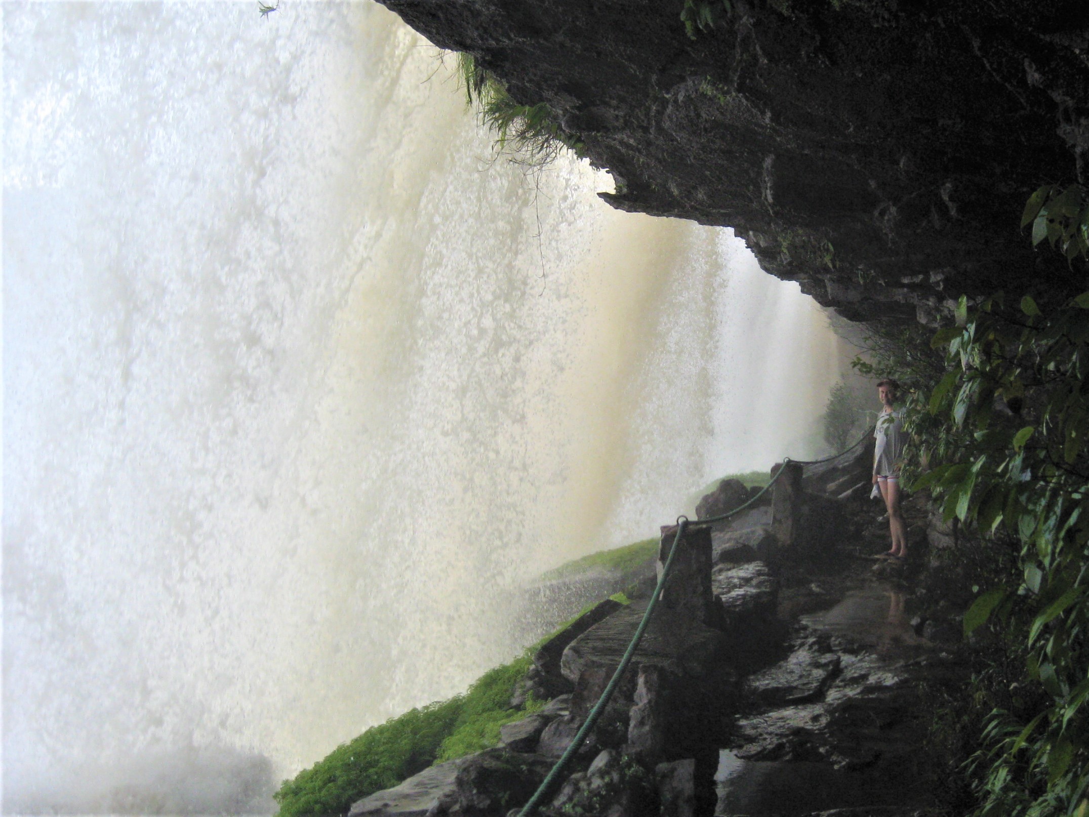 After a good couple of hours frolicking in the laguna it was time for lunch. Or so we thought. We’d been given a time so we all duly rocked up and waited for food. And waited… and waited. It was an hour and a half until we got fed. It was slowly becoming apparent that Wey Tüpü was even more liberal with the idea of time than even the rest of South America. But at least we did get food and before we knew it we’d been loaded onto motorised canoes and were being taken to a waterfall we could walk behind, Salto El Sapo. Hehehe. I love showering in waterfalls. If you had any illusions of staying dry they’d be dashed as soon as you saw the sheer power of the water you’d be walking behind. Not only did it fall straight down, in parts either due to wind or rebounding off rocks the water was thrown straight into you, almost knocking you off-balance. There is no shower on this earth as refreshing as a waterfall shower and once we emerged through the other side we were treated to a small swimming hole where we got to chill out for a while.