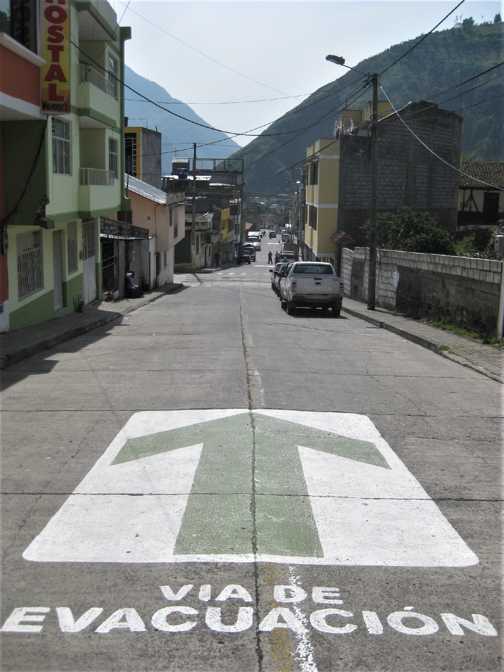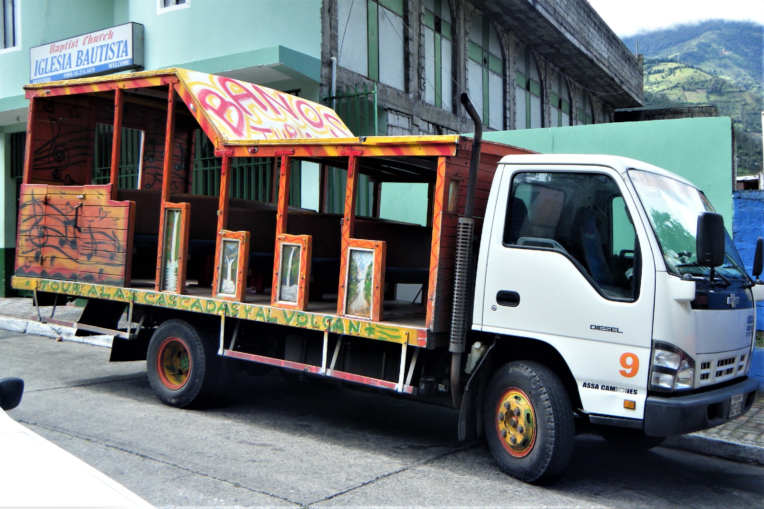 I travelled here from Quito with Matthias and Katja who I’d bumped into a few times in Colombia and finally hung out with in Salento, and Valerie, a chick we met in Quito, and on our first night we were offered a trip up a hill in a truck called a chiva where we’d be fed a tonsil melting liquor I forget the name of, possibly because it dissolved the brain cells that information was stored in, whilst we marvelled at Baños by night. Well it killed the time and I thought it was kinda cool but it turned out that most people had been mis-sold the tour as a “volcano tour.” Ohhh-kaayyy. Baños is very definitely at the foot of an active volcano, Volcán Tungurahua, as the large, painted “Via De Evacuación” signs on the roads advising you which way to run for your lives in an orderly fashion in case of an eruption remind you, but the last time it spewed anything was a couple of months ago and that was ash and smoke.