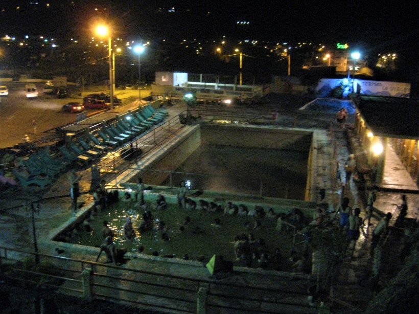 We figured we weren’t going to get much further today so Matthias and Katja caught a bus back with their bikes and me and Valerie headed back in our buggy which clearly gets us more Cool Points. And what better way to wind down after a hard days pressing a gas pedal than a nice, hot bath? When in Baños it’s compulsory to take a dip in the aguas termales. There’s 4 or 5 of them but one of them, Piscina De La Virgen which is the one right by the waterfall, opens from 6pm for those who prefer an evening dip. That’ll do. We bumped into Marion who we know from Quito here an all which was cool, gotta love the gringo trail, and spent an hour or so soaking in hot water then jumping into cold water which apparently is good for your body in several ways.