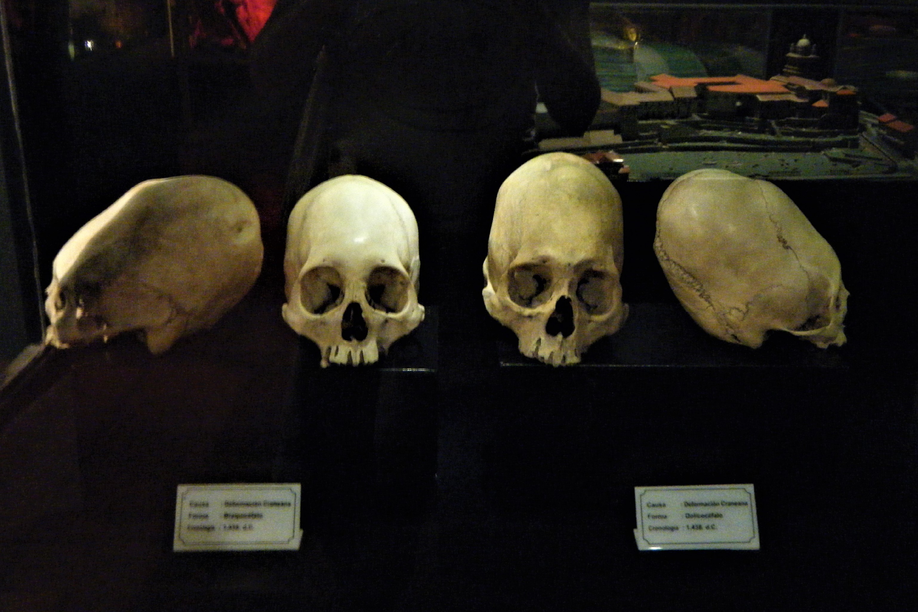 I had all kinds of images of a mummy curled up in a foetal position, the position in which they were interned in urns, sat under an umbrella by a river with a fishing rod, or amongst the other fans at a footy match wearing a scarf and a knitted with his team’s colours. Crispy, dead Incas propping the local bar up, flaking desiccated flesh into his pint. Actually that sounds like some of the patrons at one of the bars I used to work at. It’s an insane thought today but yeah, that’s what they used to do. The new ruler was expected to start again with new staff and palaces because the old lot were still looking after the old king in his old house. They also had some deformed skulls and that was news to me, I didn’t know the Incas practised cranial deformation. It was all to do with social class, the more fucked up the skull the higher up the hierarchy they were. Crazy motherfuckers they were, if that’s high class I’ll take peasantry, thankyouverymuch.