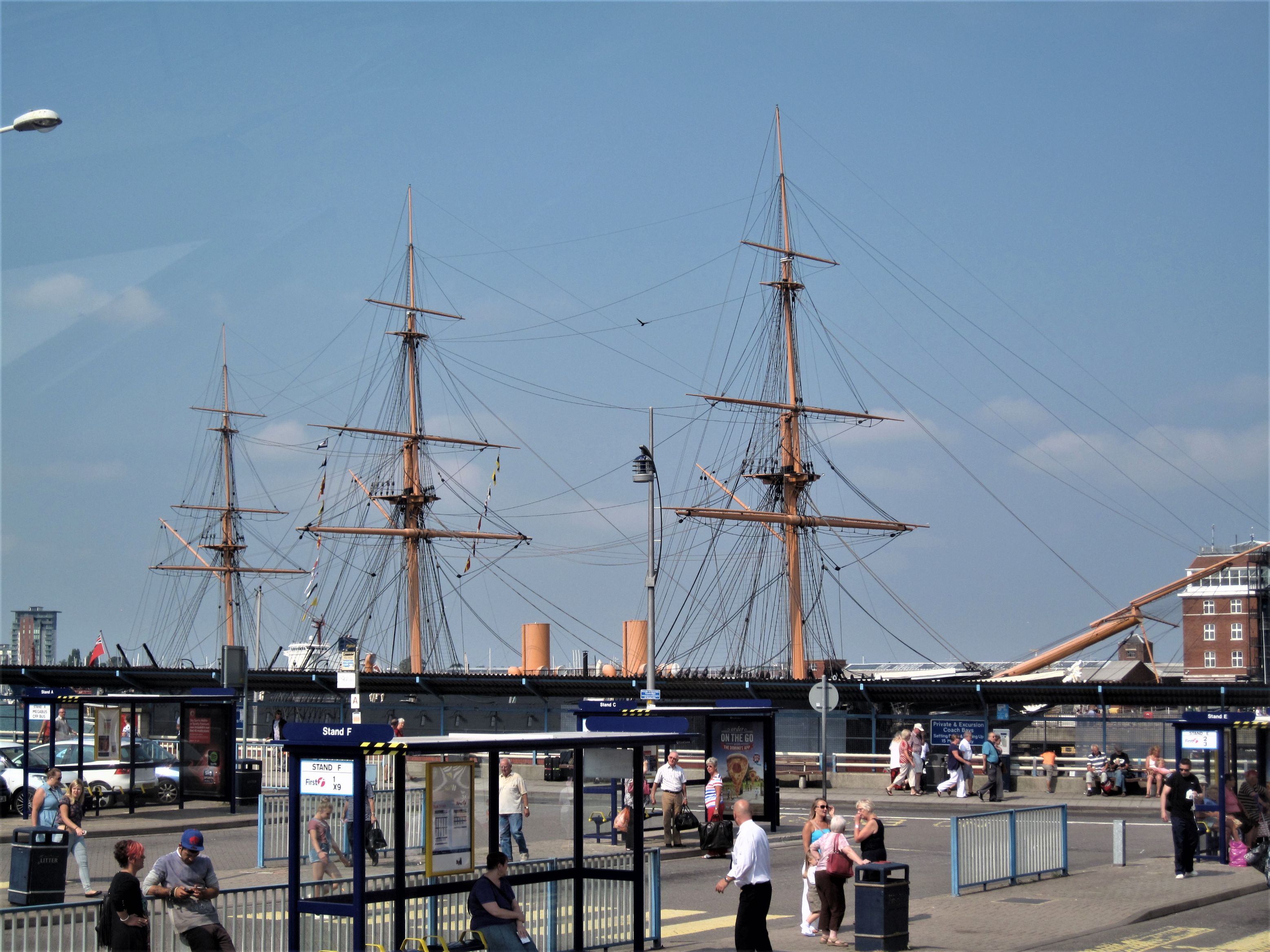 So yeah, we dragged ourselves out of bed and consumed the appropriate amount of porcine flesh to enable us to at least make it to the bus stop in town to catch the Coastliner 700 from Brighton, all the way to Southsea in Portsmouth. A quick pit stop at the nearest multi-national caffeine dealer later and we were on the bus which cost less than £10 for both of us, one way. Perfect. We settled into the seats at the front of the top deck and prepared ourselves for the arse-cheek-numbing three and a half hour journey.
