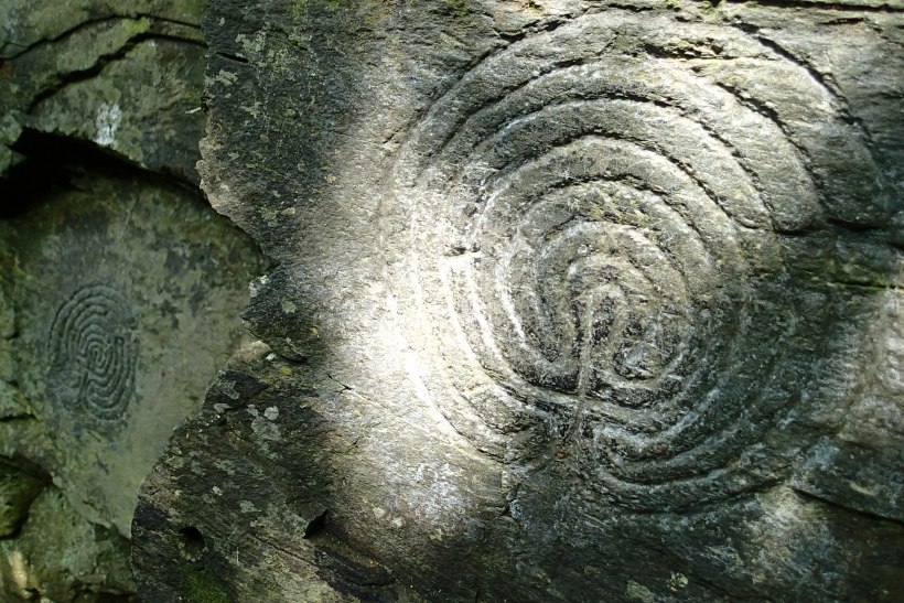 When you get to the “Tintagel 2¼” way mark you’re sorrrrrta kinda halfway through. At this point you’ll have just walked down a big fucking hill and there’s a big fucking hill to walk up, right ahead of you. We were having a water break when a woman wandered down a third path, off to the left as you get to the bottom. She told us that there were some ruins of an old mill and some Bronze Age carvings, less than a 5 minute walk that way. So we headed that way, because any excuse to put off walking up that really quite large beast-hill. This area is called Rocky Valley and whilst I don’t know anything about the awesome little mill, the labyrinth carvings are mentioned in the Witchcraft Museum. Apparently, labyrinths were important to west country witches. I’ve since found out that there’s a bit of dispute as to whether they’re genuinely bronze age as some folks think they’re too deep. We also have no idea why people hang coloured ribbons from the trees…