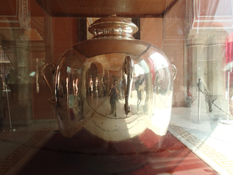 Then it was onto City Palace which I’d already heard was a load of bollocks but it was either pay my ₹400 or wait in the canter. I should have waited in the canter. The only half interesting things are the huge, silver urns called Gangajali which are, apparently, the largest silver objects in the world. These happened when Maharaja Sawai Madho Singh II was invited to the coronation of Edward VII all the way over in England. Clearly he needed him some holy river water to take along. None of that Thames shit for him, thankyouverymuch, so he used these 345kg jars made from 14000 melted silver coins each to transport water from the Ganges all the way to Britain.