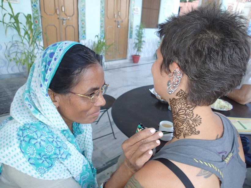 When I was wandering up the massive hill to the fort in the morning, I stopped off at Hill View Restaurant for a feed and got chatting to a the lovely woman who I think owns it. She also does henna which I haven’t had much of an interest in getting done because, well, it’s all a bit pretty init and I don’t like having stuff drawn on my hands that isn’t a shopping list or a make-shift map to the nearest pub. But fuck it, it’s one of those things you do whilst you’re in India init along with photographing cows and getting the shits so I swung by on the way back down after spending, and I’m not even shitting you, about seven hours up there. I can’t speak highly enough about this fort.