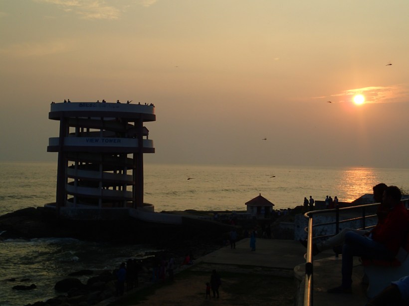 You really really really don’t need two nights here ay, but I had so much time to kill before heading back to Varkala for Christmas I just booked in for two. Franziska was here too but in a nicer hotel without illumination that’d trigger a neurological disorder. And the whole fucking town was packed out! I thought it was because it was Sunday but it was just as busy on Monday an’ all. I was told by a Hare Krishna from London whilst I was in Kovalam that it was a really significant place on account of the fact that’s where Hanuman, the monkey god, built the bridge to Sri Lanka to help Rama. Actually she’s wrong, the place she’s thinking of is Rameswaram. People, whether they’re Hindu or Hare Krishnas or not, flock here to watch the sun rise over the three seas. They also come to watch the sunset and there’s a monstrosity of a concrete lookout tower, with a spiral ramp that wouldn’t look out of place in a multi-story car park built in the 70’s, that you can climb up for ₹10 for the least spectacular sunset India has to offer. I liked it though. It gives you great views and you can get a real sense of just how many people there are in town, watching the fiery sky ball sink right at the bottom end of India. It’s a good atmosphere. It usually is when you put a bunch of Indian tourists in one place, they know how to have a good time and they don’t have the same inhibitions as we do in the west. They’ll scream and shout and disobey warning signs and generally just enjoy life.