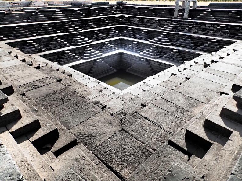 So I have a bit of a thing for stepwells, known in Kannadan (the language of Karnataka) as a pushkarani, so I really wanted to see the one they have here but could we find it? Could we fuck as like. We cycled a short way. Then we cycled back again. Then we fucked off the whole idea of trying to find the official entrance, parked up the bikes and tried to find a way cross country using a reluctant Google Maps as a guide. We made our way across dirt, scrub and rubble until we finally came across this pretty impressive hole in the ground. Boom. Stepwells used to be used to store water back in the day when groundwater was higher. The steps are so you could get down to the water regardless of how low it was. They’re also generally freakishly photogenic. Apart from when they’re used as a rubbish dump, then they just kinda look a bit septic, but eyehole related ruins are Hampi’s big thing so they keep this one in pretty good nick.