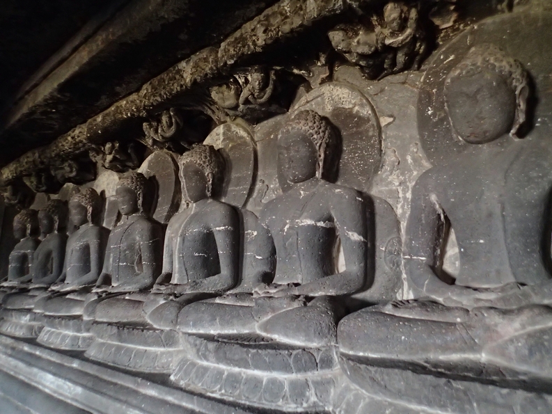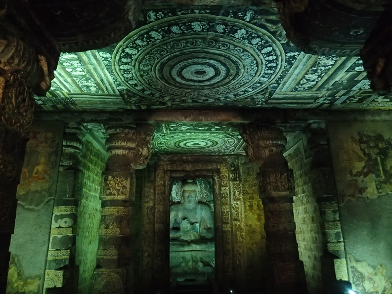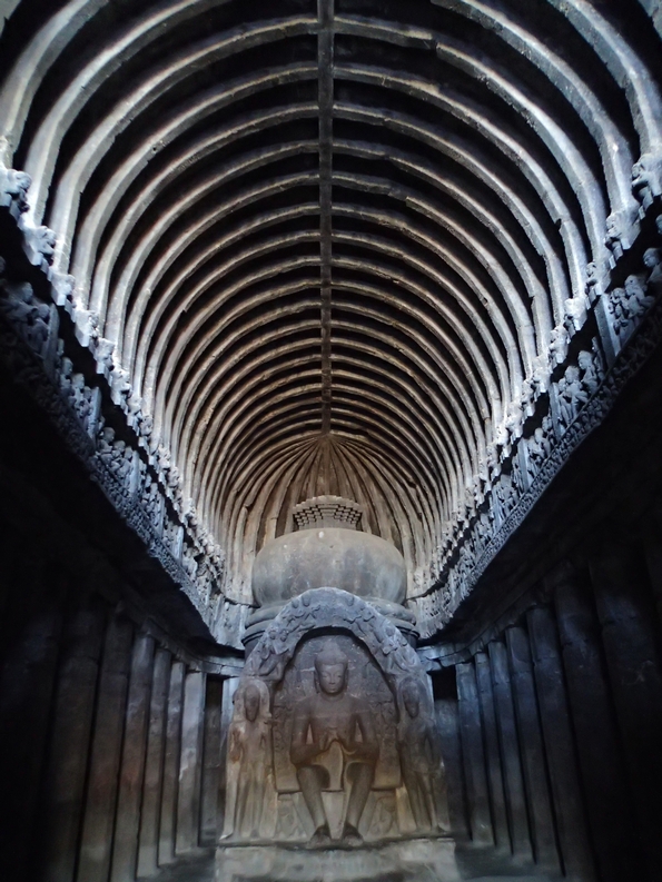 Apparently it took over 200 years to complete and once it was finished it was plastered and painted, and a fraction of this artwork remains. The cleaner ended up showing me around with a torch for a small tip which I appreciated, I’d have missed a lot if he hadn’t been there. I wandered around the complex until hoards of school kids started filtering in then I bolted to Cave 1. So Caves 1 to 12 are Buddhist and I know two tenths of fuck all about Buddhism. I wish I’d learned something about it before coming here though ay, I think I’d have gotten more out of it. There’s all manner of talk about Buddha’s previous incarnations and people called Bodhisattvas. The caves range from vast, empty, unimpressive rooms to slightly more impressive rooms with carvings, and most of them have an inner sanctum containing a statue of the Buddha, usually flanked by these Bodhisattvas who, according to Google, are enlightened beings. So that’s nice then. All of the caves were monasteries apart from Cave 10 which is a chaitya griha, which I think just going off the information boards is a Buddhist cathedral. It’s my favourite Buddhist cave at Ellora, it can’t be easy trying to keep it varied when there’s only one main dude in your religion. You’re kinda stuck with seeing how many different ways you can carve the same sitting down guy into rock but with Cave 10 they pretty much out-did themselves. There’s still the Buddha as the “object of worship” and behind him there’s a stupa which is, and again I had to turn to Google for this, a mound containing Buddhist relics and can also be an object of worship. That ceiling though! That’s all carved out of stone.