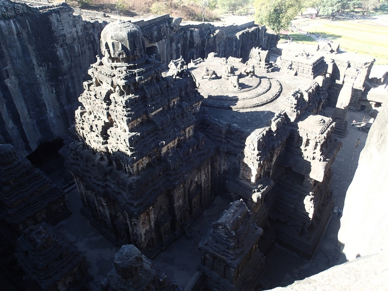 What makes Cave 16 so special that I felt it necessary to not only sacrifice my sleep time but to also upset my fragile collection of thinking cells by viewing the caves out of order? Ok, see if you can get your head around this. Cave 16, the Kailasa Temple, is the largest monolithic structure in the world. For those who haven’t just swallowed a dictionary, this basically means that every single thing you see was carved from the same piece of rock. Everything. Every shrine, column, idol, statue, every single thing was once part of that one rock, which was a solid part of the hillside, until someone carved it out where it stood. The block of rock used was isolated, in place, from the surrounding hillside, excavated from top to bottom then scooped out from the outside to the inside. Everything that was to be used for the artwork had to be carefully left where it originated. There was no margin for error. And to put the size of it in perspective, there are two life-sized stone elephants in the courtyard and the temple dwarfs them. It actually melts my brain a little bit.