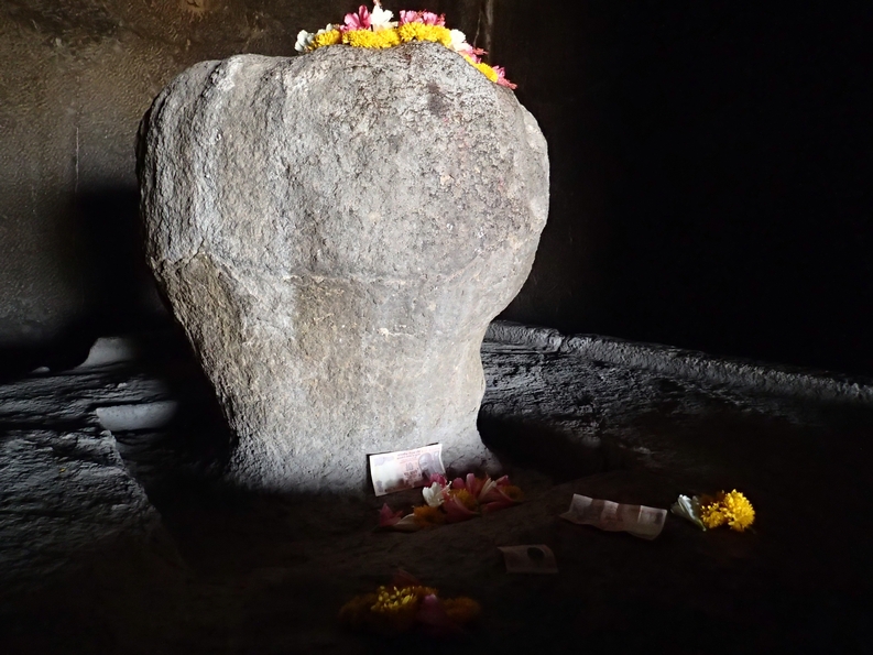 No more Buddhas. Seriously. I couldn’t look at any more Buddhas. Hindus though, they have way more to play with. They have multi-armed gods and their vehicles, and their dancing consorts invariably have fantastic boobies which some people clearly couldn’t keep their paws off given the fact they were shiny and dark and stood out in colour from the rest of the carvings. Caves 13 to 29 are way more interesting and the ever-devout had left flowers and money as offerings draped over Shiva Lingams housed in inner sanctums. I’d also discovered a little path that lead above the Kailasa Temple for a better view from above.