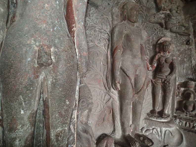 Caves 30 to 34 are Jain caves and again, I know very little about Jainism. I know their basic principles of non-violence and their belief in energy as opposed to a god, and that they say every single thing has a soul, from humans right down to insects and plants. I had no idea what to expect from the caves though. Turns out there’s a lot of cock. Cock everywhere. In place of a god, Jains worship their tirthankars, the 24 men who I guess could be described as leaders or teachers. They’re enlightened, clearly, because ain’t no one gonna follow a dude who isn’t enlightened. They also don’t seem to wear clothes. The carvings here are of the tirthankars and they aren’t shy about whipping it, out and they also seem to be surrounded by women with perky knockers.