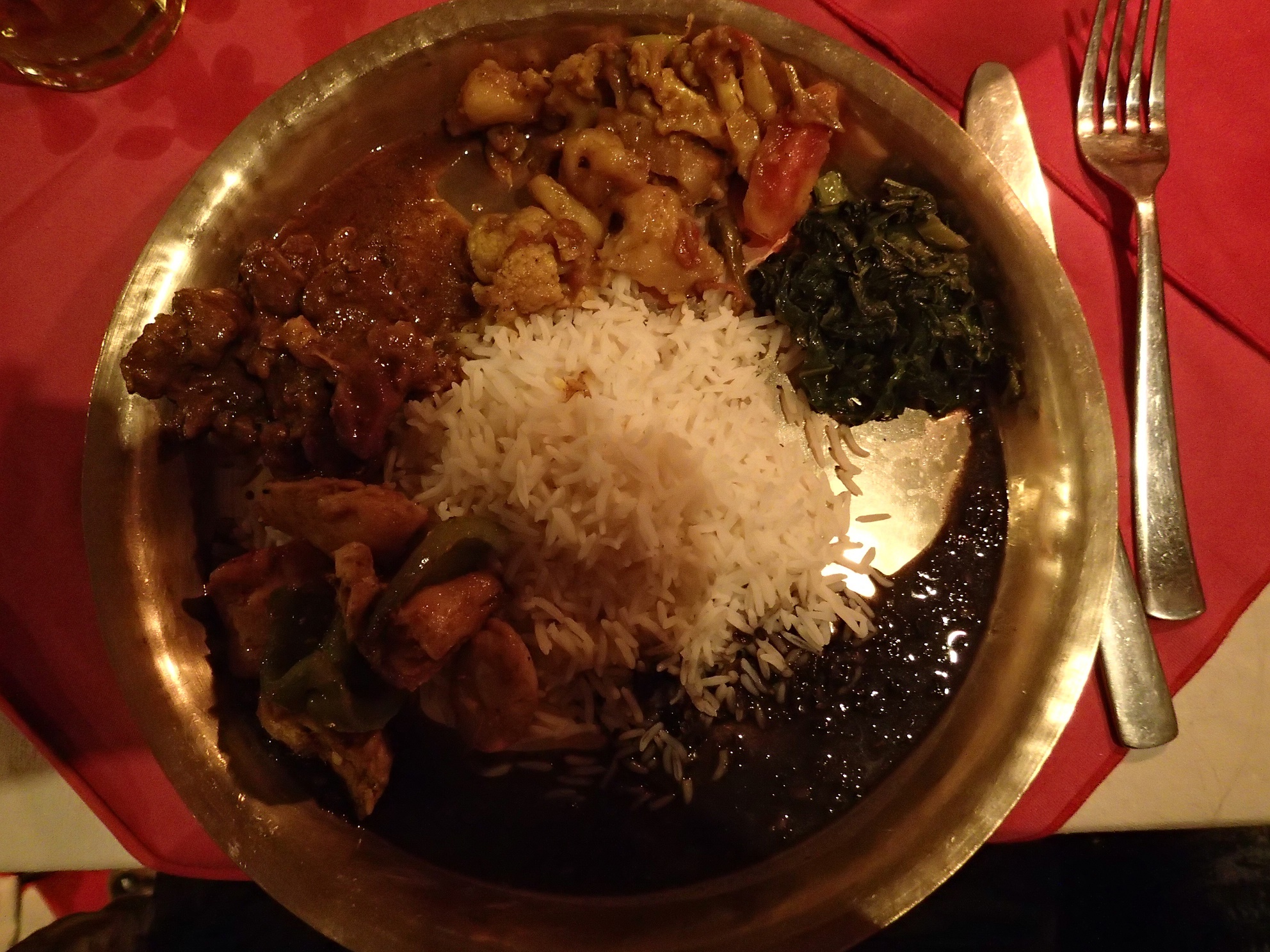 The plate of food, that photo was taken at Thamel House which is a cool, albeit pricey, restaurant in Thamel which is the main tourist area in the city. They have a show from 7pm and you can either have something off the menu or, as we did, go for the set menu where you get to try loads of little samples of Nepali and Newari food, as well as a drink called raksi which is a rice wine often made at home, and they will keep bringing you raksi until you have to beg them to stop because it’s burned all the tastebuds off your tongue. I liked it! Incidentally, if you’re looking to rent good trekking gear at a decent price, there’s a shop opposite Thamel House called Deep Love. Don’t be put off by the fact it sounds like a bad sex shop, they’re very honest and very fair.