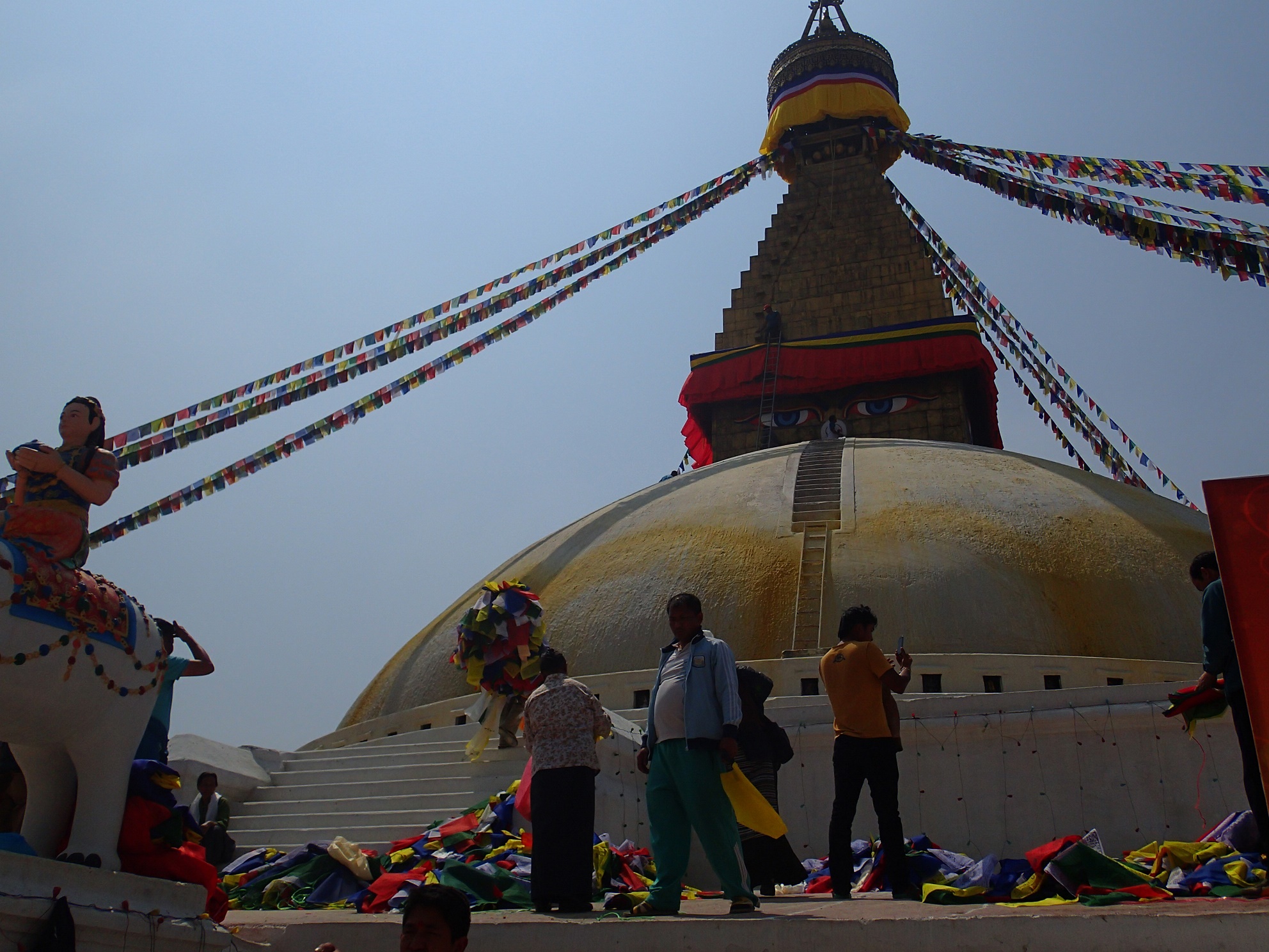 So the photos above this paragraph, that’s Boudhanath Stupa which is a UNESCO world heritage site. From what I can gather it’s a very important stupa, with a stupa being a structure that Buddhists can use as a focus for prayer, and they contain religious relics. Well you can’t miss this bad boy as a focus. It’s huge. Deepak told us that the Buddha’s eyes are painted on each side of the spire so he can look north, east, south and west and he will always be watching you. Like Santa Claus. But less hairy and less concerned with lists.