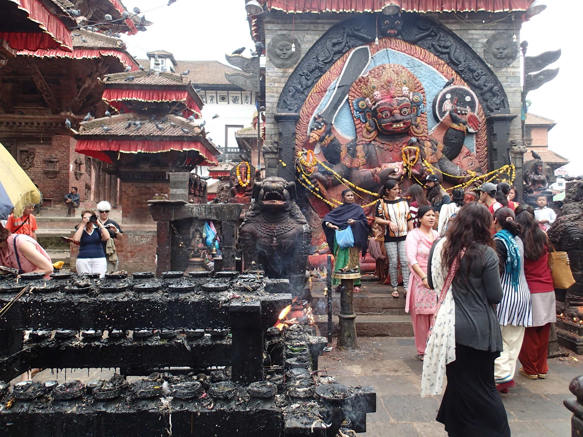 So anyway. Me and the second to be spawned from our mother’s womb had time to kill before the rest of or Everest Base Camp posse rocked up and, apart from throwing ourselves off bridges in the middle of nowhere, we generally spent it wandering around the city gawping at freakishly photogenic things. Kathmandu is such a vibrant place full of noise and colours, narrow streets with tall, mismatched buildings, ancient and elaborate temples, and roadside shines surrounded by oil lamps and offerings. Once the rest of our group landed and me and Nat had checked out of our twelve bed dorm and into a lovely, comfortable private room which was part of the large sum of money we’d parted with for this, dinner was had with the group so we could do that getting to know the people that you’d be spending all of your time with over the next couple of weeks thing. Well they all seemed pretty cool. And the following day we were to be lead around the city by a bloke called Deepak, and this guided tour was also included in the package and guys, it’s so worth it. A lot of attractions here are UNESCO and will cost you between ₨1000 and ₨1500, which might not sound like much but when you’ve been in South Asia for six months you balk at the thought of spending more than a couple of quid on a meal so huge you have to be physically rolled out of the restaurant. I probably wouldn’t have visited all of these places if left to my own devices.