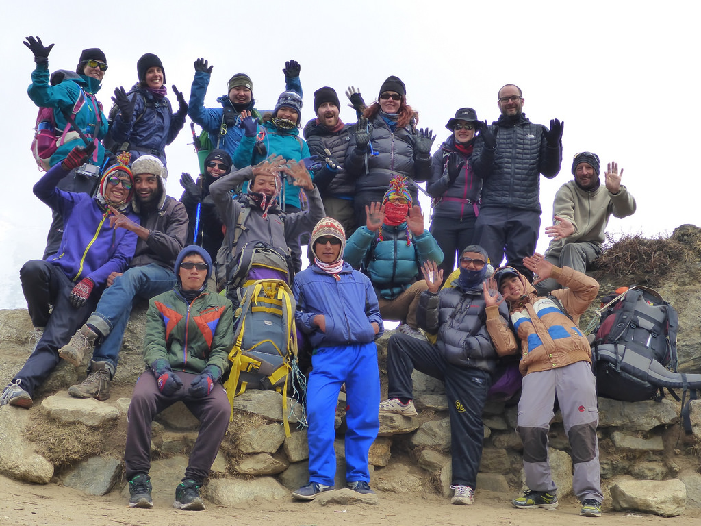 Today was the first day we’d almost kept pace with our porters. We’d just been leaving our bags out and buggering off and they’d magically appear at our next destination. We had five porters between the ten of us and our bags only weighed around 10kgs, so each porter was carrying 20kgs of our crap plus his own, hopefully making it under the 25kg maximum it’s recommended that you should allow a porter to carry. We’d met a Russian chick at one lodge whose group thought it was fine to get their porters to carry four bags each. We asked her how heavy their bags were, thinking maybe they packed lighter than us because Russians are double hard and don’t feel the need to pack all of the thermals in the world, and she replied they were about the same as ours. You’re shitting me?! They’re carrying 40kgs each? I mean, I have no doubt they’re capable of it but I wouldn’t feel in any way comfortable making another human being carry that much crap up a hill. I genuinely appreciated our porters and the work they did for us and it was good to take a quick rest with them and rope them in for a group photo. Not that they knew what jazz hands were, and even once they did they were totally above indulging the tourists and their slightly odd jazz handy ways.