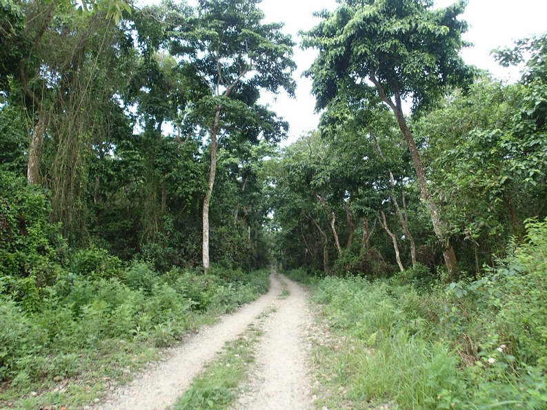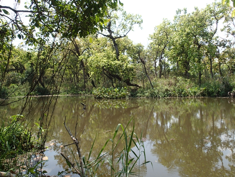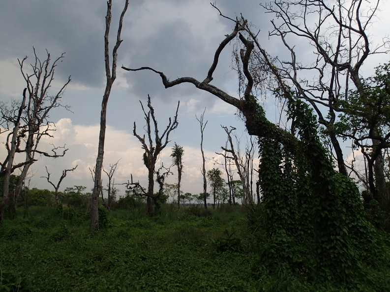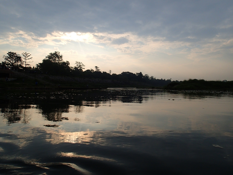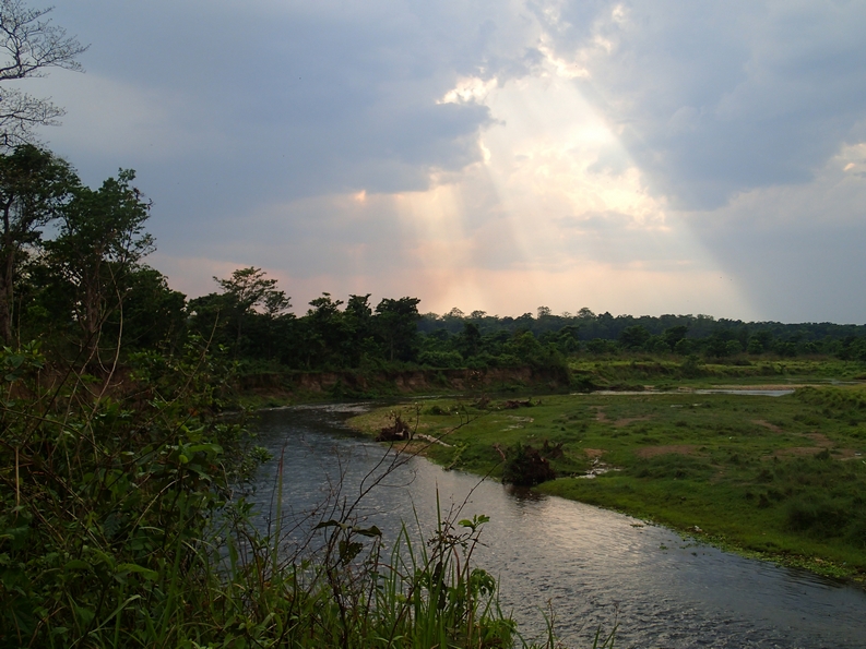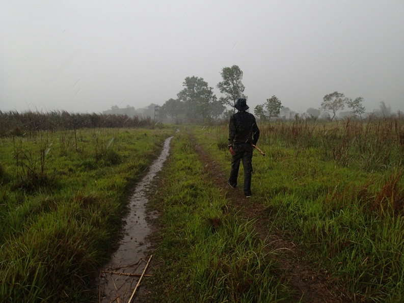 Let’s talk about the weather than shall we? It was perfect walking weather to be honest. Cloudy, not too hot. There was a bit of spitting in the morning. It stayed like this for most of the day until around 2.30pm when suddenly all of the clouds in the world decided to dump their contents unceremoniously on Chitwan. Fuuuuck. And not only that it was massively fucking windy all of a sudden, the rain came in sideways, like someone had let loose with a pressure hose on us. We legged it and took shelter behind posts supporting a watch tower, all of us were soaked down one side. We chilled in the watchtower for a short while until the rain stopped, wringing out our clothes. Meh, this is nothing. That’s a pleasant spring morning in Brighton, is a spot of sideways rain. They guys said a few words in either Nepali or Tharu to each other before one of them said, “Anyway, we are already wet, there is a river with a place where people can cross easily.” Cool, sounded good. I envisioned an ankle deep crossing point and off we went.
