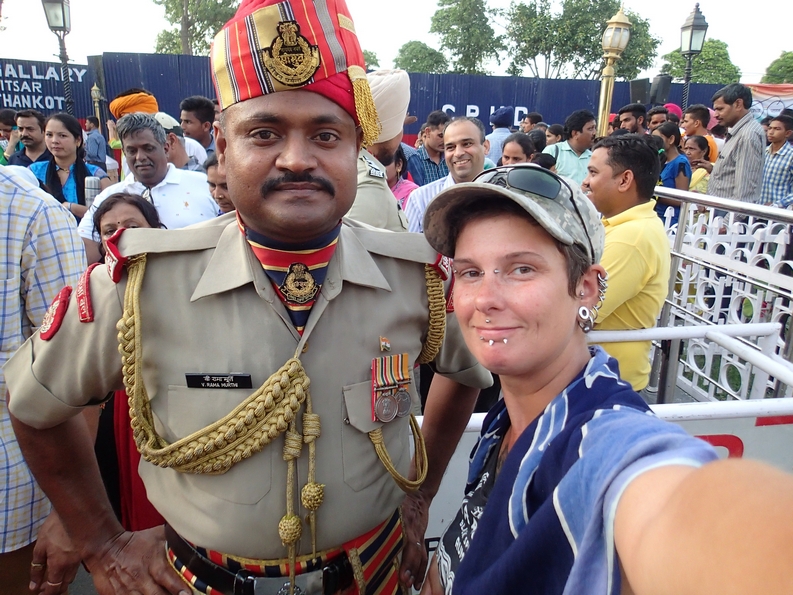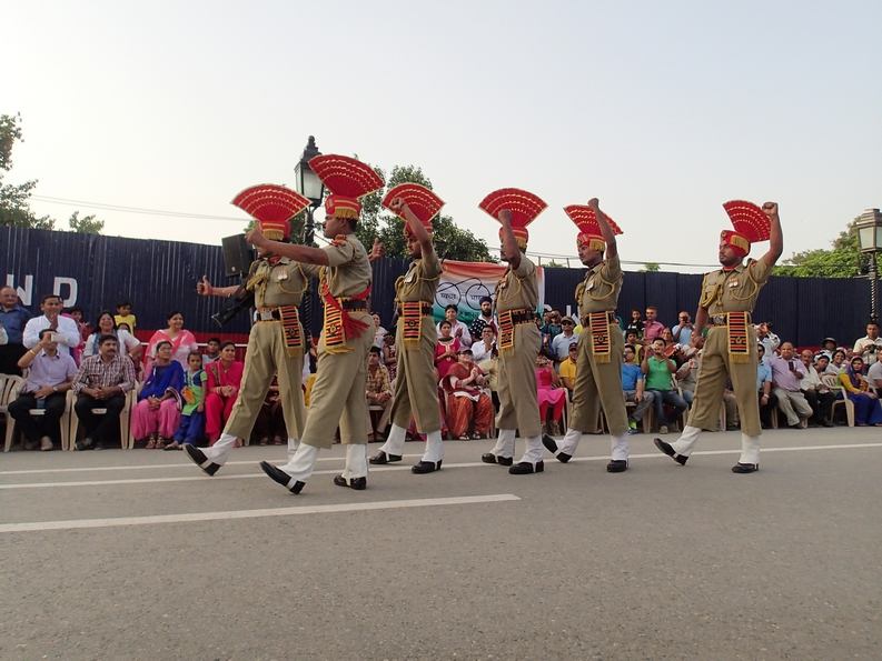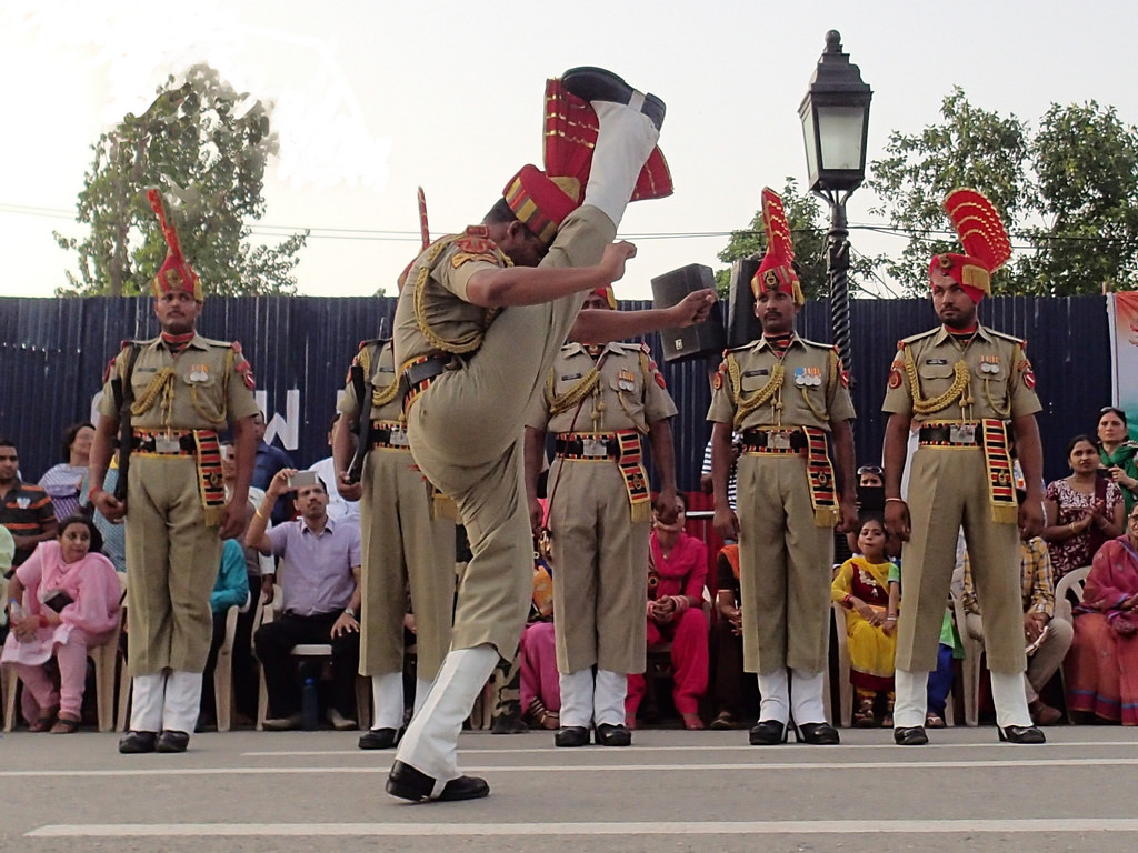 This ceremony though! It’s fantastic! It starts off with members of the public running up and down with flags which no one in the UK would do. If someone tried to pick anyone out of a crowd back home to wave a flag around the whole crowd would sink back in their seats and pretend to be invisible. Here, it’s an honour. Then for some reason a crowd of women from the crowd will gather and dance. A voice over the tannoy system will get the people worked up into a patriotic frenzy. Then it’s basically half an hour of posturing, gesturing and demonstrating the ability to examine one’s own ankles without having to sit down and make old lady noises with some pretty impressive high kicking. It’s all totally choreographed, everything worked out and agreed between the Indian Border Security Force and the Pakistan Rangers. And when I say high kicking. Dude. Let’s face it, the days most of us could kick like that disappeared the day we discovered vodka and cheesecake. And the best thing? The stills just look like disco is occurring.
