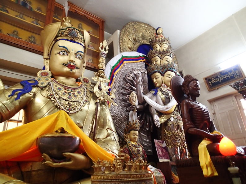 We spun some prayer wheels and took photos where we were allowed to which included these statues, one of which was of Guru Padma Sambhava who was an Indian chap who went to Tibet in the 8th century and taught them all tantric Buddhism, so they like him quite a lot. Enough to put his statue next to one of the Buddha and a statue of Avalokiteshvara, the Bodhisattva of Compassion and the patron deity of Tibet. All very important entities, though I’m not sure the Guru’s statue is a perfect likeness, and if it is he looks fucking mental and really quite terrifying. As for Avalokiteshvara, if you’re wondering about all the arms and faces, that’s just because he’s a totally stand up bloke. A Bodhisattva is an enlightened being who could totally achieve Buddhahood should they want to but they choose not to because they’d prefer to remain here and help all sentient beings. Avalokiteshvara wanted so badly to help everyone through their hardship, but when he listened out for the cries of the suffering there were just too many voices and his head shattered into eleven pieces which could have been really really messy if you think about it. So a deity took pity on him and out him back together with eleven heads so he could hear the cries for help, but when he reached out to comfort them there were too many and his arms shattered into a thousand pieces. So again he was reassembled, this time with a thousand arms so he could reach out to more people. The Dalai Lama is said to be a manifestation of Avalokiteshvara, except he has the more conventional two arms and one head and he reaches out to people with Twitter.