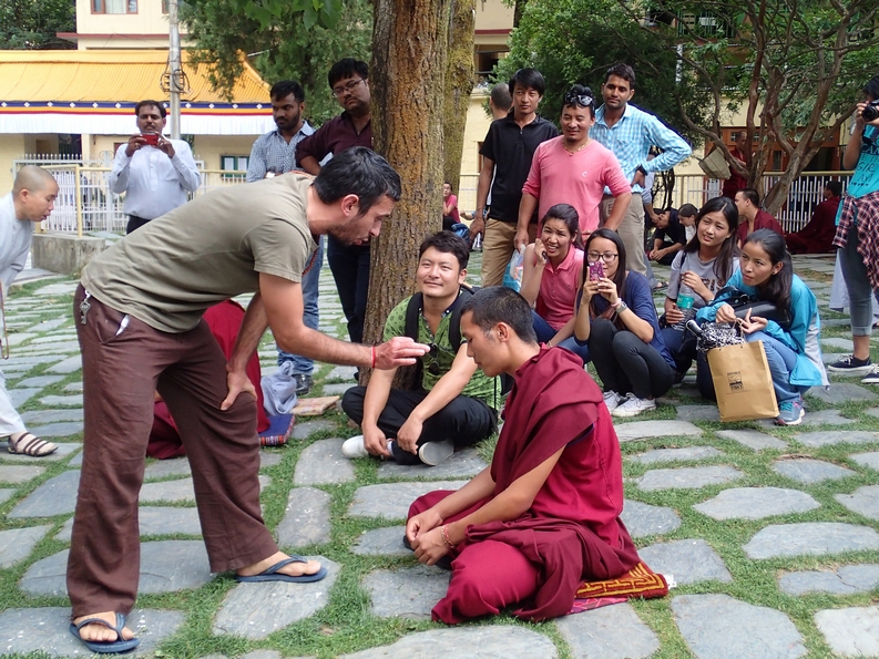 Anyway, these debating monks we were about to gawp at when His Holiness rocked up. As the Dalai Lama teaches in Tibetan, the monks here debate in Tibetan, and they drive their point home with a single clap. As opposed to when I debate. That generally involves poorly made points driven home by drooling, followed by a few choice obscenities when I realise I wouldn’t be articulate enough to win a debate with a monkey. Anyone, it seems, can join a debate here as long as they can speak the language. It was mainly young male monks, a few older male monks, a Buddhist nun, and a very angry white guy. So one person sits on the floor and the other person stands up, then they fire points at each other, but I don’t understand Tibetan so I’d no idea what they were debating. But the angry white guy was really going for it, screaming and gesticulating and pushing the guy sat on the floor, putting his hand on his head which I thought was a terrible, offensive thing to do to anyone but I’d read somewhere it was a huge insult to touch a Buddhist monk on his head. These guys were the main draw, the monk sat on the floor kept his cool really well, I’d no idea what the white guy was saying but even I wanted to step in and punch him in the face. We watched for a while before we headed back to Bhagsu, and the next day we asked Om if we could have the morning off yoga on the Sunday to go and watch the Dalai Lama teach. We even saw the Dalai Lama in his car again a few days later.