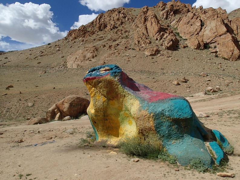 This is so much fun though. As you freewheel down the hill you pass people working on the roads, bandanas covering the bottom half of their faces to protect them from the dust, and they all waved to us as we cycled past and called out, “Julleeeyyyyyyy!! Julley julley julleeeyyy!” which I’m pretty sure is a friendly greeting around here. Everyone says it so either everyone is friendly or everyone hates us. Eventually I pulled ahead of Austin, he wanted to carry on taking his time and I wanted to get on with it, plus I’d mastered the art of riding one handed and taking selfies with the other thus cutting down the need to stop every hundred metres. Heading back through South Pullu posed no problems despite not having a permit, no one even gives you a second glance, and as you get closer to Leh the roads become sealed. Thank fuck for that. Just getting on a bicycle makes me very glad I don’t have testicles, I already felt like I’d been kicked in the cunt and I wasn’t even there yet. On I went, past a rock that someone had painted to look like a massive stone frog, and when I got to a choice of directions I stopped. Oh. Bollocks. I literally had no idea which way to go and since I’d lost my phone way back in Dharamsala I had no Maps.Me. I put my bike down and walked a little each way. Nope, none the wiser. I contemplated waiting for Austin or the support vehicle, but I’d no idea how long that would be or even if the support vehicle had already passed me. So I made an executive decision to stay on this road instead of turning off, because how lost could I get, right?