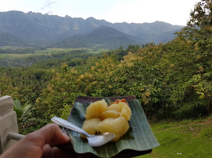 There are a couple of volcanic craters in the area and the driver took us to see one called Kawah Sikidang on the way back to town “kawah being the Indonesian for “crater”. We didn’t know this until it was too late, but the entry ticket you buy here will also get you into the Arjuna Temple Complex. It’s… well I don’t know what to make of it. It’s obviously a big bed of rock and sulphur, and you can walk along a path lined with stalls selling everything from souvenirs to vegetables and, of course, potatoes, to get to a boiling pool of water. It’s odd. Go see a crater, do your weekly veg shop. And to cap it all off they’ve stuck signs proclaiming the name of the crater everywhere so you can have your photo taken in front of them. There are people with captive owls which you can have your photo taken with, and there are swings, like playground swings, which are again only there for the photo opp. And there’s a statue of a gorilla. I’m not even shitting you. I don’t know why it’s there. We climbed up a hill on the other side of the boiling pool for the view over the whole thing before heading back through a field of selfies with domestic tourists to the car.