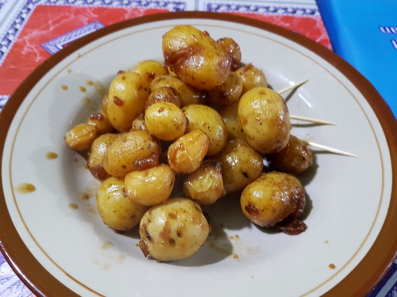 I can’t remember the name of the volcano in front of us but that classic cone shape, letting off little puffs of whatever it is volcanoes let off little puffs of without wiping out entire towns, it’s very very pleasing to the eyeholes. We all just chilled there as clouds swirled and dissipated and it got lighter and lighter. The sun eventually rose behind some broken cloud. Guys, it was beautiful. But fuck me, we were starving. Dwi took us to look at another pretty view before we headed down to the food stalls that line the way because as I said, this is a big, big thing and it was hard not to launch myself at vendors to relieve them of all of their potatoes on the way up. Because potatoes are also a thing here. They can’t grow rice, it’s not warm enough, so they just grow a metric crap tonne of spuds instead. Dwi told us that they’re mainly farming folk around here. They grow tea too, all the tea we’d been drinking was local tea and what lovely tea it was too. I like potatoes and I like tea and I like sunrises. This totally made up for the utter lack of sleep the previous night. My legs still hadn’t forgiven me though, my left quad muscles was killing me, I had to favour it to lower myself down the steps on account of a sprained right ankle which, although was pretty much healed, didn’t have enough range in it yet to get down stairs.