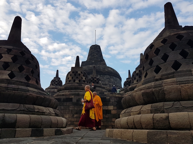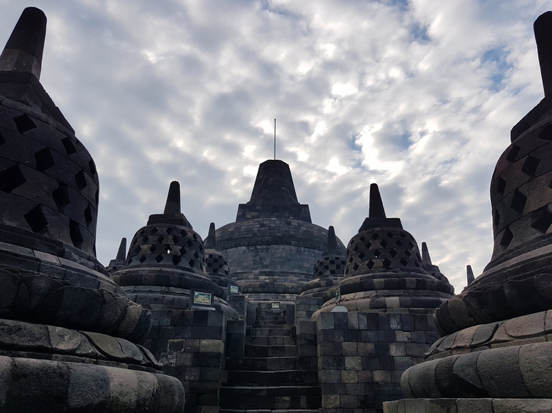 You have to walk this whole thing clockwise as you would any Buddhist monument. Arupadhatu is what the top three layers are called and they have stupas all around them and in each of the stupas is a statue of The Buddha. There’s one particular one which people used to touch for luck but you’s clearly prohibited now and they even have a guard next to it to keep people’s grubby little mitts off. And on the very top layer is the biggest stupa of them all which is apparently hollow but you can’t get inside. Just as you can’t see the top layer from the bottom, you can’t see the bottom layer from the top because you have no desire left and you’ve achieved Nirvana. If you walked the whole thing, every layer, clockwise, you’d cover 5 kilometres which is actually quite a long way without the promise of cheesecake at the end. It cost US$25,000,000 to restore Borobudur to UNESCO standards and UNESCO paid 25% of that. The Indonesian government had to foot the bill for the rest so you can see where the huge entrance fee comes from. Our guide left us at the top where we joined the ranks of the selfie makers and wandered around a bit more admiring the view, and what a fabulous sight to insert into your eyeholes. Honestly, it’s breathtaking, and in a way you like it to be and not the way that involves far too many steps before breakfast.