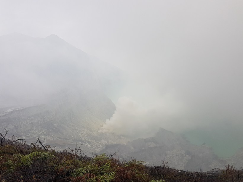By the time we made it to what we thought was the edge it had stopped pissing down but a thick fog enveloped the crater. It sucked. We were basically slogging up a fucking hill for two hours in the relentless rain for exactly fuck all. But again, might as well finish off the misery and carry on to the so-called blue flames view point then onto the sunrise point. As we approached the first lookout the fog lifted. It fucking lifted. And right there, below us, distant but clear, were the blue flames. It was really fucking cool. I do really wish we were allowed down into the crater, you could see the light of the sulphur miners bobbing around down there and I guess the last thing they needed were hoards of tourists getting dangerously close to a lake that could probably kill them in minutes.