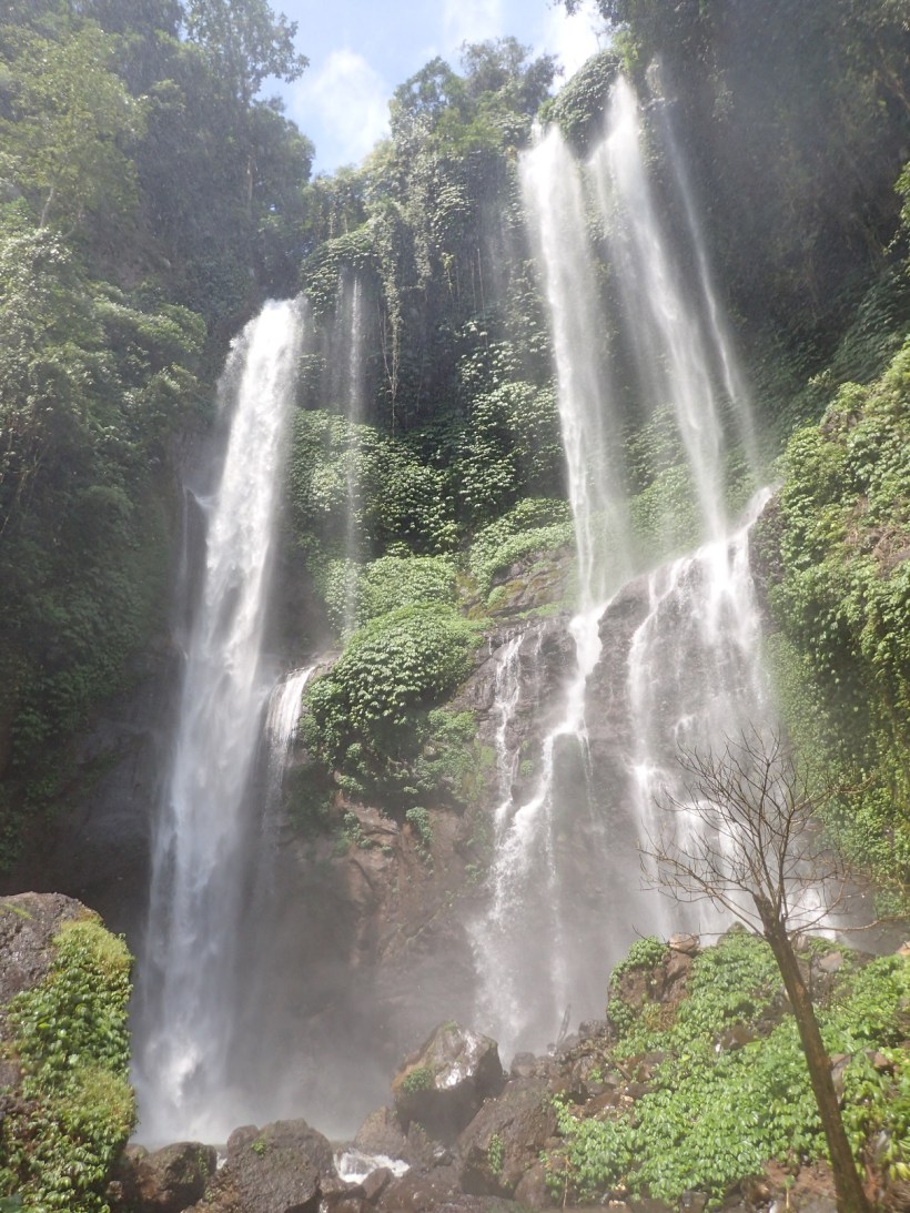 I’m about as much use as a chocolate teapot in these situations so I left them to it and crossed over to get completely soaked in the spray of the falls. Once Tarrant had gotten Poland stabilised we walked him up to the second ticket office and left him with a bloke with a walkie talkie and carried on to Sekumpul itself. Again you have to paddle over a small stream and guys, there’s no staying dry here. The waterfall is so powerful it hits the plunge pool and the spray soaks everything. We stashed our stuff behind a rock, stripped to shorts and singlet and clambered over rocks to stand in front of it for the most epic power shower ever. It’s the kind of thing that makes you go “WOOOOO” whilst sober and not brandishing a bottle of Lambrini on one hand and waving your bra over your head with the other.