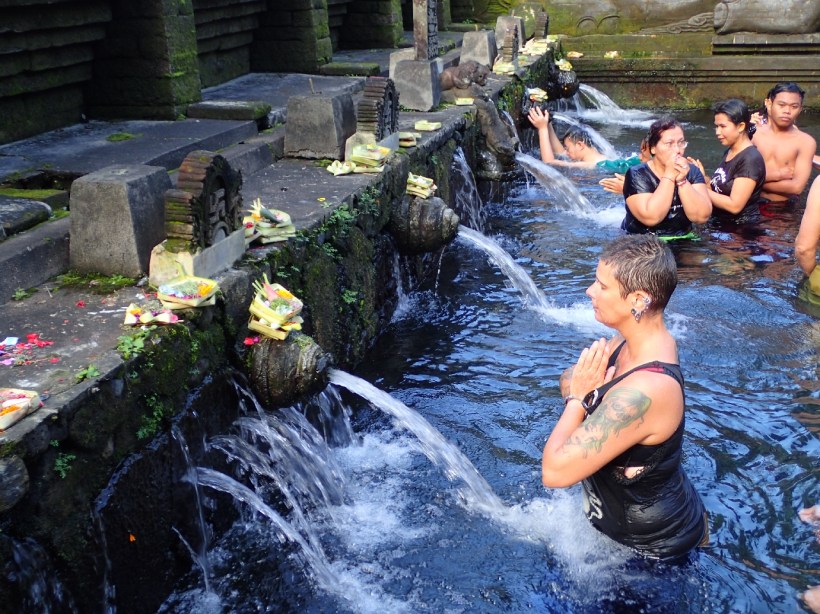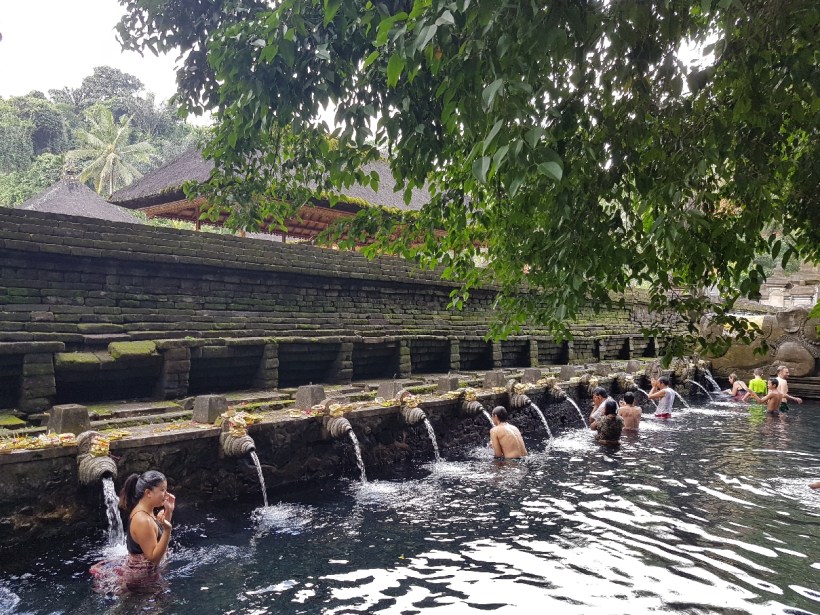 He told us that the colours all meant something, like red for love, white for purity, black for bravery, yellow for knowledge etc, and it was important to offer something to the gods when you pray, or you’d just be taking all the time. He said that Balinese always pray for a smile, which is why they use these colours, because without the things that the colours represent you can’t smile. And finally, the incense represents your connection to god. So after he sprinkled holy water on our offerings and heads, we sat comfortably, cross legged, and held our offerings next to your chest whilst we prayed. My connection to god kept going out. Bugger. Gidi re-lit it a few times before he gave up and got me a new stick. This is what happens when atheists try and get all spiritual. We prayed and left our offerings with the others then headed to the first pool.
