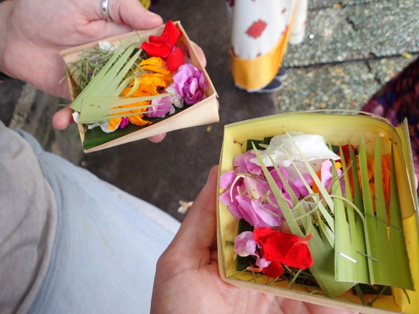 Gidi was our man. He told us that most Balinese know how to do the ritual but a lot of people just show up with no idea as to what they’re doing and end up bathing in fountains meant only for the dead. He told us that Balinese Hindus will start with an offering which he’d prepare for us if we wanted. We wanted. So whilst he sorted that out for us we stashed our crap in a locker then met up with him again by the pool. You see these offerings all over Bali; little squares made from palm leaves filled with flowers or sweets or tiny biscuits, always with an incense stick.