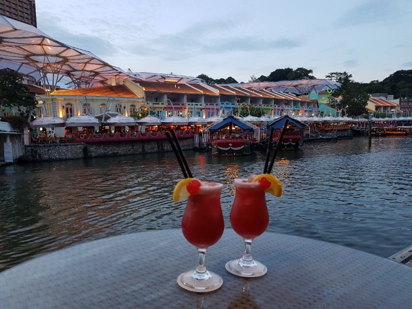 Okay, this needed to happen. We’d intended to have one at Raffles but apparently you pay a shit tonne of money for a pre-mixed cocktail so once we’d ruled that out it kind of slipped our mind. The guy at reception said we could find cocktails at Clarke’s Quay. Thank fuck for the fast and easy MRT making last minute liver abuse possible. It didn’t take us long to find a place right by the water where we could apply one to our faceholes. It’s actually a really cool place to hang out too, I get the feeling this is where the cashed up beautiful people come to part with money in exchange for food and booze. I can’t see us on a night out here unless we win lotto or reach that drunk point where you become convinced you’re a millionaire and want to buy a shot for everyone in the bar.