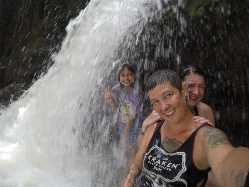 We were taken back, crawled to our belongings and our guide led us further downstream where we had a view of a waterfall. Sooo yeah, that was nice, but were we allowed in this river? She looked at us like we’d told her we planned to summon the Loch Ness Monster to take us on a watery adventure to Aqualand. “But the water is like chocolate!” she told us. Yeah but it’s only mud, it’s not human excrement or anything, right? I mean… right? She agreed anyway, I did feel kind of bad making her go in the river until it became apparent that she was having as much fun as we were. She told us she comes here with her friends a lot anyway and as we fought the river to she knew exactly where to grab on to pull ourselves forwards, and where all the ledges were so we could rest. This was fucking brilliant. We got to the falls and played in them for ages before letting the river drag us back to where we’d climbed in, hitting a few rocks as we were swept along. I’ve probably left quite a bit of knee skin in the river and I regret nothing.