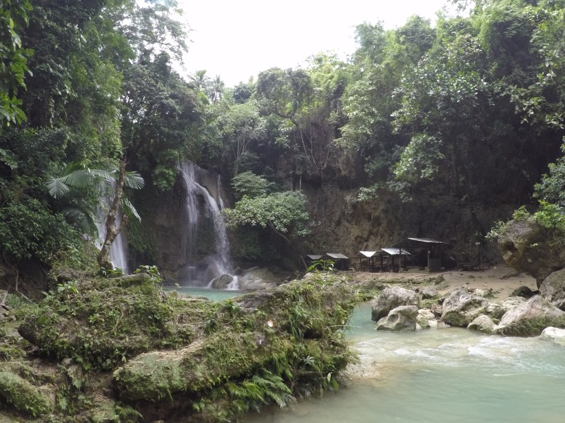 Worth it. Whereas the rains in Legazpi had turned the last waterfall we swam in to the colour of mud, this was still a gorgeous, milky blue colour. It was freezing bastard cold of course, we both made the obligatory involuntary monkey noises as we shuffled in, but once you’re in it’s amazing. There’s this little cave to the right and the waterfall thundered over the rock face to the left. Someone had put a rope swing up which we couldn’t quite climb up and there was a knotted rope leading up the falls too. I figured I’d injured myself enough for one day and didn’t attempt it but I’m betting in peak season this place is full of people chilling in the cottages you can rent and playing in the water.