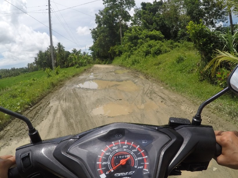 There are these waterfalls called Can-Umantad Falls and we really wanted to see them but we also really didn’t want to end up in a ditch. Again. We spent ages bouncing along an unsealed road that, of course, got worse and worse the further we got from the main road, but then you reach a fork. The left fork will take you down a very short, easy road to a spring. It’s the right fork you’ll want if you want to see the waterfalls. We sat at the bottom of this slight incline, straddling our recently scathed rental scooter, staring at the road. Except it didn’t look like a road. It didn’t look like it had ever been a fucking road. It looked like a rocky dry riverbed.