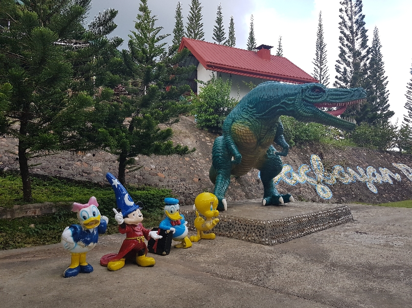 Anyway, clutching our plastic bags of chicken, rice, fried egg and some manner of unidentified dead stuff which had been processed and fashioned into a circle, we drove to Sagbayan Peak. This is an odd place, possibly made odder with it being off season and about to rain so there was hardly anyone else there. We paid our ₱50 each and shuffled up the concrete slope where we were met by a T-Rex and several cartoon characters. So entirely random. The next level up is where you access the viewpoint and you walk through a load of information boards detailing Chinese horoscopes, a canteen which may or may not have been open but it was impossible to tell because it was in darkness but there were staff who seemed to be trying very hard not to notice us, and more statues of cartoons plus a lion and a tiger.