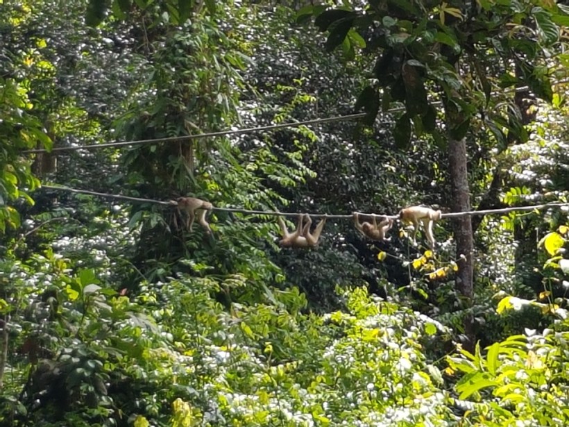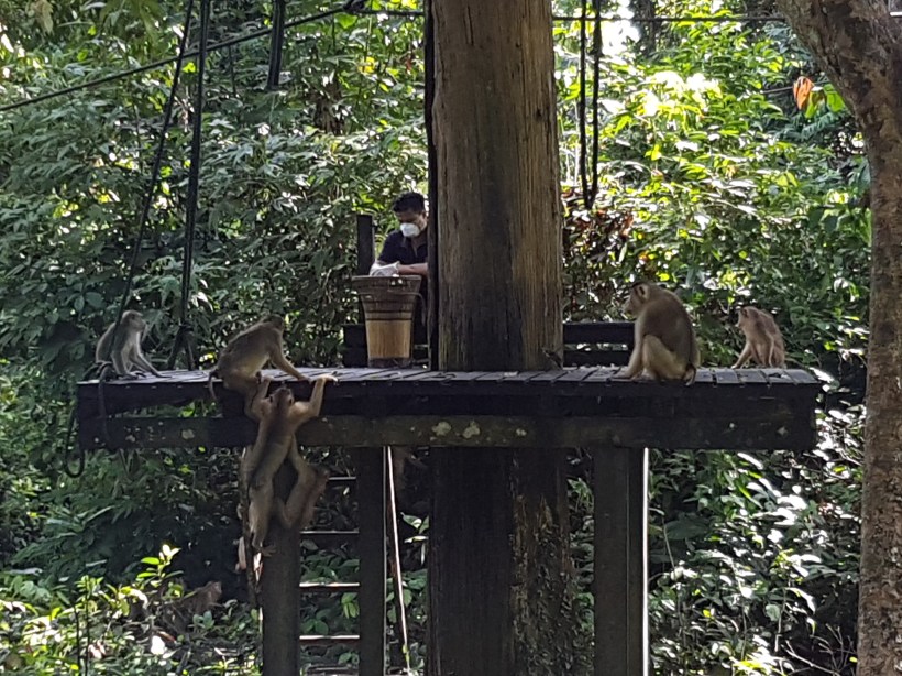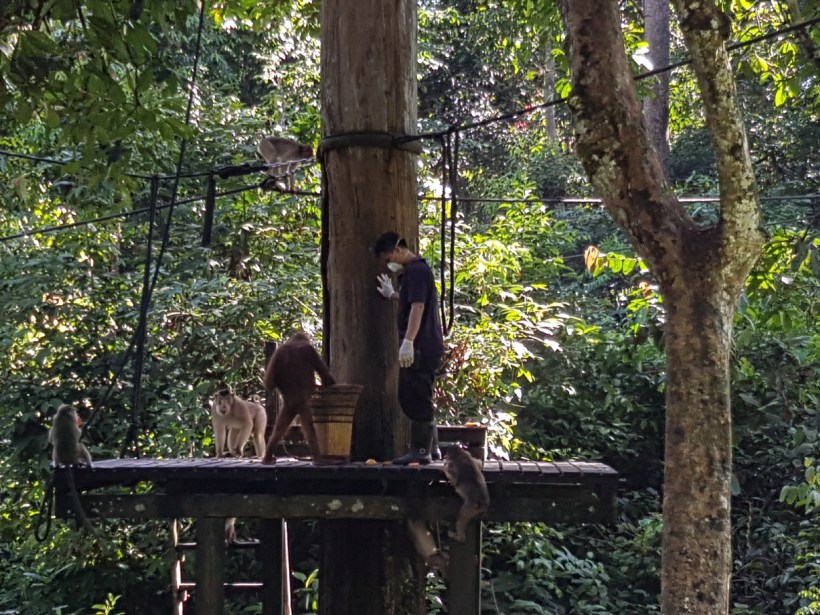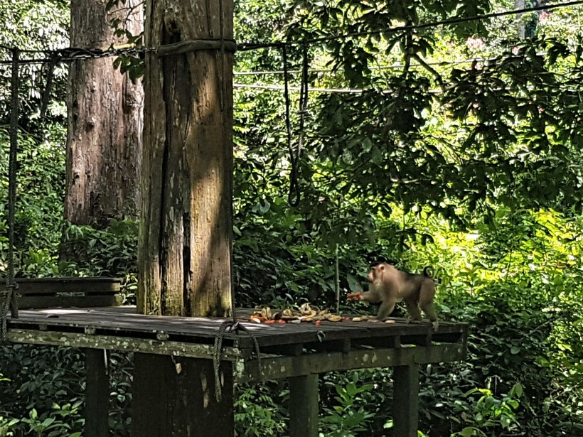 When the next feeding rolled around we were ready. We flounced in, waving our tickets, loudly announcing that we’d already seen the nursery and were heading straight to the feeding platform. There was no one else there as we watched a group of pig-tailed macaques playing on the ropes, occasionally harassed by a lone long-tailed macaque. They were so much fun to watch! They’d run at each other along the ropes before flinging themselves into the bushes below. Hours of fun until the ranger came along at feeding time. There were less tourists here at the afternoon feeding, but there were too many monkeys around for him to just dump the fruit and leave, they’d have it away quicker than a shoal of piranhas could strip a carcass.