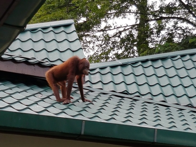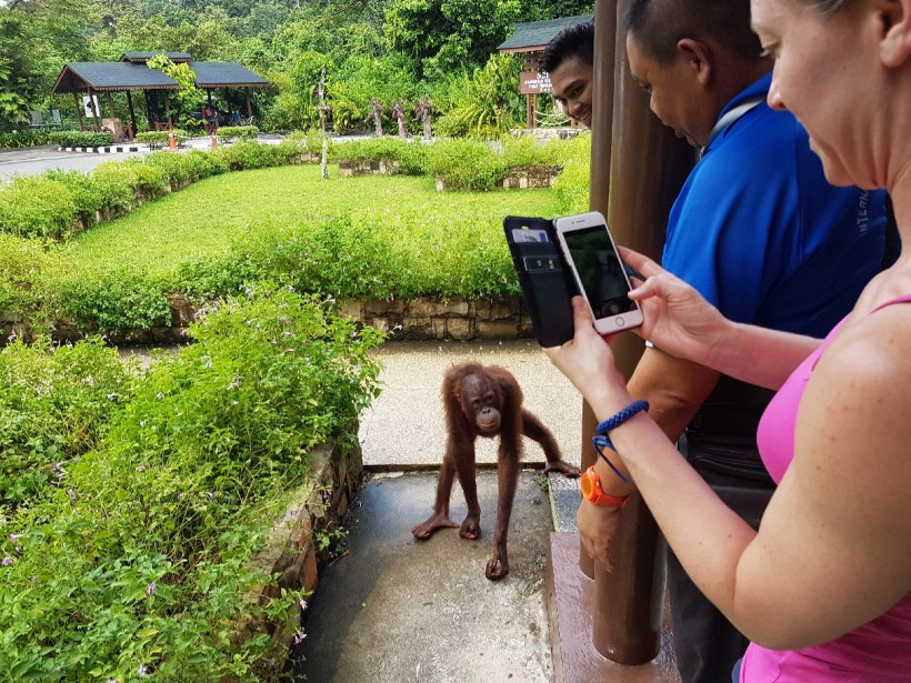 There was commotion outside, people were jumping up and bolting to the door so of course we joined them because that’s what humans do. See a crowd? Follow it! An orangutan was strutting down the walkway like she owned the place with a staff member in tow, unable to stop her. They managed to guide her away from the door to the cafe, so she just climbed up a concrete beam to the roof and chilled there for a bit before heading over to the other side and helping herself to an empty five litre bottle of something or other. She hung around for a while, the rain started up again and she took shelter under an overhang on the roof. It was quite amazing. She carried on about her day as several humans just gawped at her like slack jawed imbeciles until she disappeared off back into the forest.