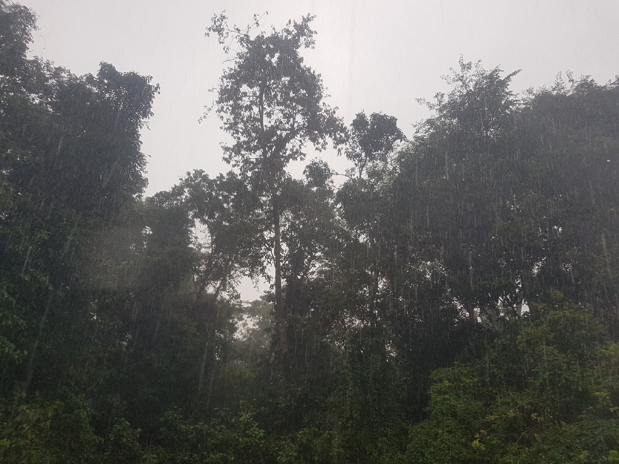 So yeah. It started pissing it down pretty much as soon as we got into the boat, around 2.30pm. I’m talking the kind of rain you only get in the Tropics. Think buckets. Nat and Laura were decked out in fetching polka dot ponchos they’d bought in some manner of big variety store in KK which transferred the colour of the dots directly onto your skin at the mere hint of rain. I can’t claim that myself and Tarrant were any drier, our jackets could only be considered waterproof if “waterproof” was just a different way of saying “highly absorbent”. We had those pack-away waterproof trousers you can pick up at Sports Direct for a tenner but I’ve noticed they always seem to leak around the crotch area. It’s like they’re mocking you. But at least they add a vaguely windproof layer.