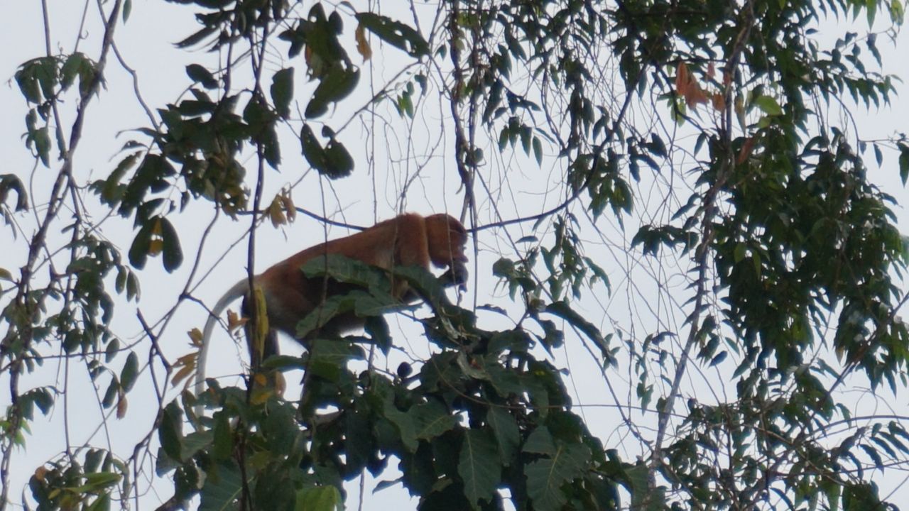 The plus side of having a guide who gave exactly zero fucks about the weather was the fact that we were already out on the river way ahead of the other groups as the wildlife started to emerge. We saw load of cool stuff including a hornbill drying it’s wings off, tens of macaques, and we got our first sighting of a harem of proboscis monkeys. These guys. Now they fell out of the ugly tree, bless them, with their scrotum noses and pot bellies. In any one group there’ll be a big male and the other monkeys will be his females, plus any kids. You can tell the male. He’s massive. Oh, and he’ll have his cock out.
