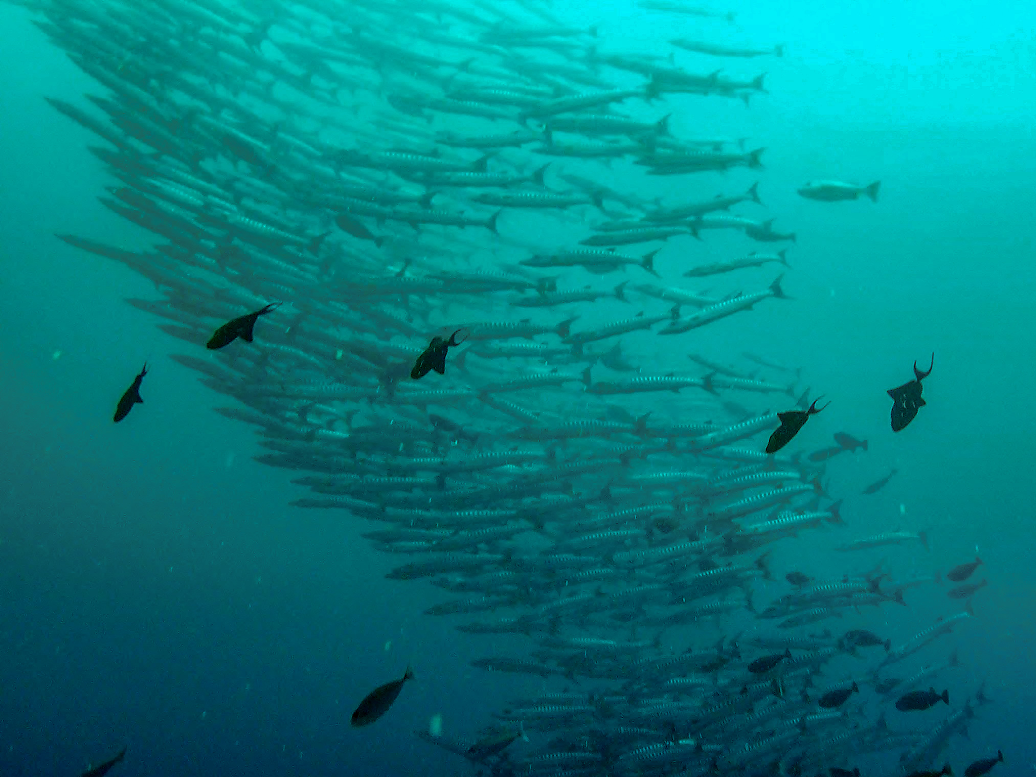 Then we saw what the dive site is named for; the chevron barracudas, a metric shit tonne of them schooling in a breathtaking spiral mere metres away from us. Yeah so I get a little bit nervous around barracudas on account of the fact they have a penchant for shiny things and I don’t take my piercings out to dive. I have the shiniest face in all the land. I’ve never had a problem with them though but I’ve never seen so fucking many in one place before and as Armen told us afterwards, if they chose to they could, and I quote, “slice you like a samurai sword.” Comforting. I stared at them in absolute awe and felt myself slipping further down the food chain.