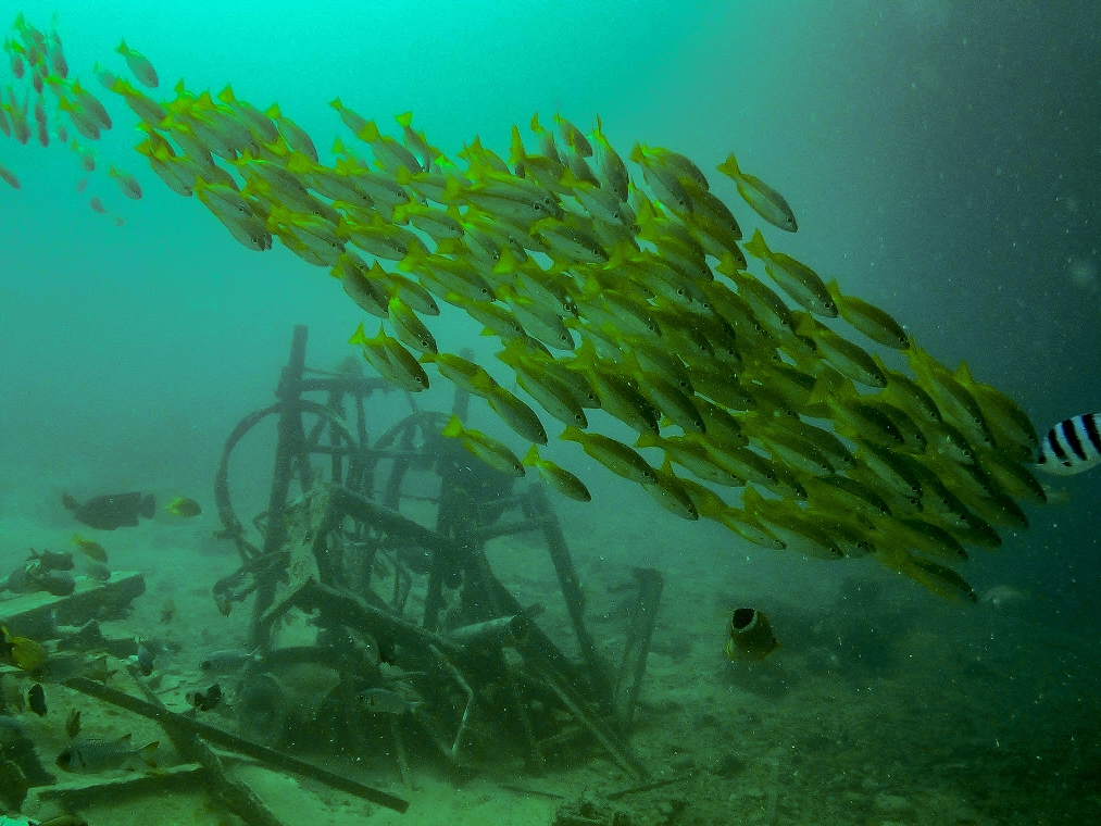 Romain, one of the French guys I was at Sipadan with, joined us for the third dive at Stingray City which didn’t live up to its name. Romain caught a glimpse of one as it headed for cover, I just saw its tail, but to be fair there was so much other stuff to see I wasn’t going to have a cry about it. Not long after we’d descended we were surrounded by yellow fish, the name of which I forget. I don’t think it matters how many times I see schooling fish, I will never fail to be utterly awed by it. I think it’s one of the most incredible things, hundreds of individuals moving as one like that, I could watch them for hours.