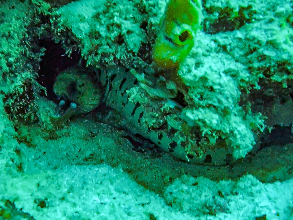 We got to the wrecks and the current swept us around them at record speed which at least meant I could finally get level with Tahir without bursting a blood vessel. We saw loads of cool stuff including a puffer fish, and that’s when he found a spot face moray eel hiding inside a rock. He gave me his little metal pokey stick to steady myself so I could get a better look and guys, it’s the most beautiful thing that looks like it would rip your face off given half a chance I’ve ever seen. Not the mush, that’s a face only a mother could love and even then only after several tequilas, but the markings on it.