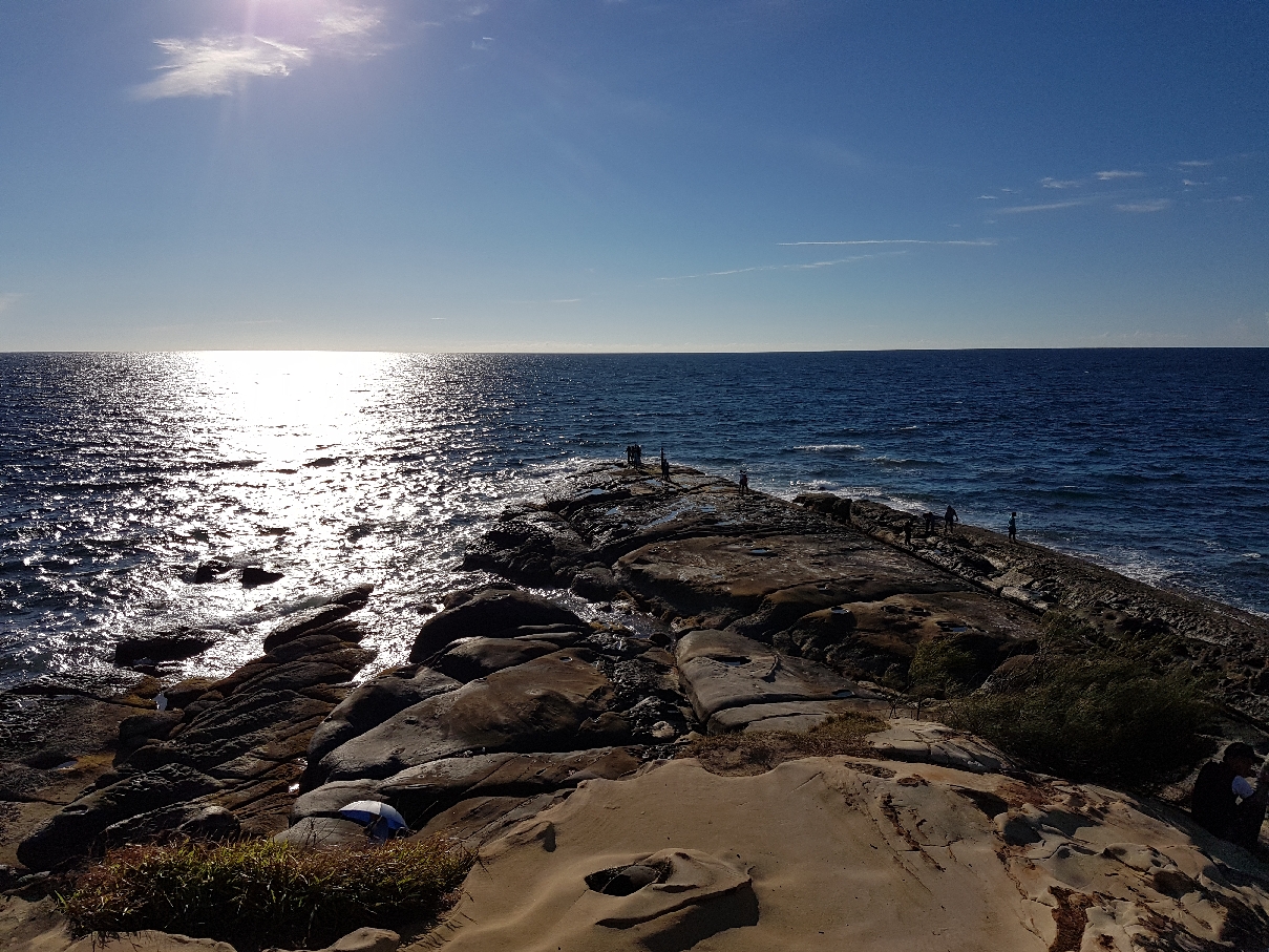 It was Saturday which meant it was busy but it wasn’t super stupid can’t move for humans busy and guys, it’s incredible here. The tide was out so we could walk past the barrier onto the rocks to get to the actual tip. I’m not usually one for rule breaking but the rock formations alone were worth this minor act of rebellion. It’s a petrologist’s wet dream, even the rock pools are interesting shapes, it’s sort of like the surface of the moon except with water and a breathable atmosphere and a bloke fishing off the end. Yeah so fuck all like the surface of the moon really. We went back a few days later when there was no one there apart from one fisherman which meant we could get our obligatory selfies in front of the monument.