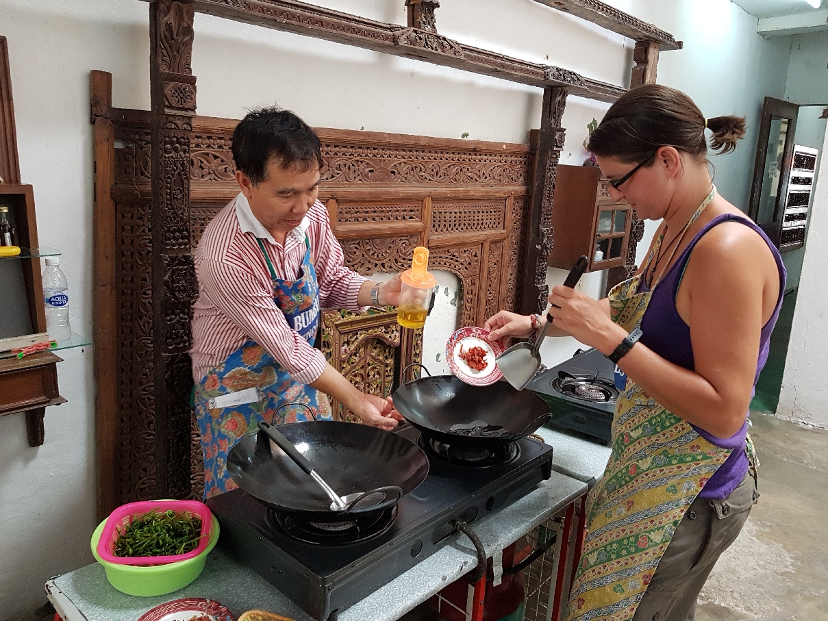 Weirdly though if you take me to a foreign country and put me in front of a human who will teach me to cook something I’m all over that shit. I fucking love food. Well, I love applying it to my facehole in quantities that upset my entire digestive system anyway. We happened upon Bumbu cooking classes in Kuching during a little stroll down Carpenter Street and booked ourselves in for three hours of knocking up what ended up being the best damn meal I’d wrapped my chops around in a long time. Don’t get me wrong, I’m fond of food in Malaysia, Laksa is the way and the light and proof there is a god, but we’d been getting tiny portions and not much meat and I was growing concerned that Tarrant would start chewing on my limbs in the night.