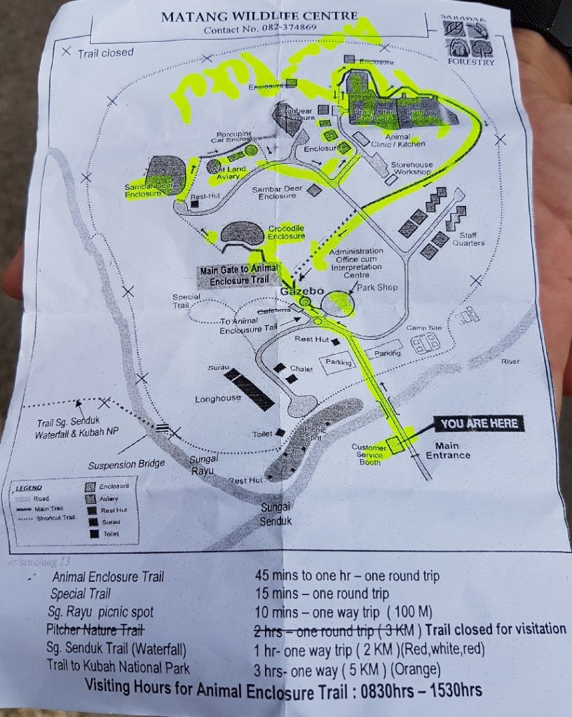 Two and a half hours later and we limped into Matang Wildlife Centre which is basically a zoo, but it’s a zoo that only exists on account of the fact humans decided they wanted to steal an animal from the wild and keep it as a pet. They’ve all been confiscated and whilst they try and rehabilitate and release as many as possible it’s still an inherently depressing place. If you take your entrance ticket and accommodation receipt from Kubah you don’t have to pay to get in, we wouldn’t have actually gone at all if we’d had to pay an entrance fee, we’d already read that it was a bunch of creatures in cages. I believe feeding time is around 3pm but we didn’t want to hang around that long on account of wanting to get back to Kubah before it got dark which meant we were left to wander around the enclosures and wince a lot at the conditions the poor animals are kept in.