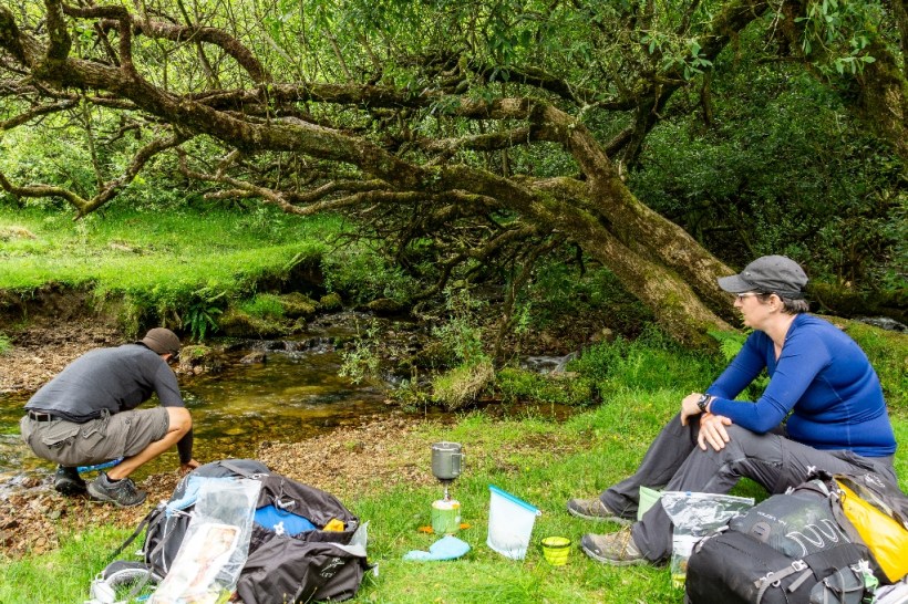 We pushed on through the gorse back to the road and I could have kissed the tarmac if I thought for a second I’d be able to get up again. We slogged up the last little incline and rejoined the Two Moors Way. Just after Ponsworthy there were some woods with a river running through them so we figured now would be a good time to refill our water bladders because we didn’t have a water source at our next camp. We’d worked out that we needed just under half a litre each for dinner and a cuppa, and the same, of course, for breakfast. It was nice to actually just sit down by a river for a while as we filtered water, and not be hiking over stepping stones or through gorse. We’d smashed through nearly our entire supply too, we hadn’t thought about our water properly it seemed, luckily we could easily access this river.