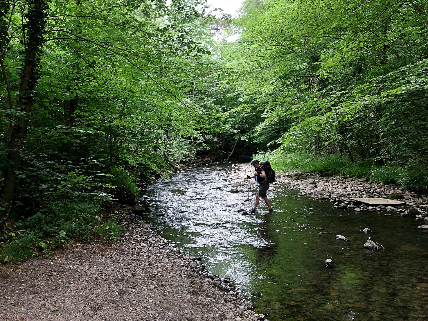 I left Tarrant with the bags and popped to the Spar to grab us a few cans before we continued away from the town. We’d decided to start looking for a place to camp as soon as we were through Clitheroe and we found some woods almost immediately. Okay, we were still quite close to town but these woods had a lovely little brook running through them and it was hard to resist. The footpath on this side of the stream was defined but blocked in parts by trees and nettles so obviously not too well used, and we made our way through to a small clearing right by the stream. It looked a lot more inviting on the other side though, there was a large space just perfect for hanging out as I’m sure many locals did. Rather than going around we just crossed right over, footwear and all, it was only ankle deep and oh my gosh the cold, cold water was delicious on our hot, sweaty feet.