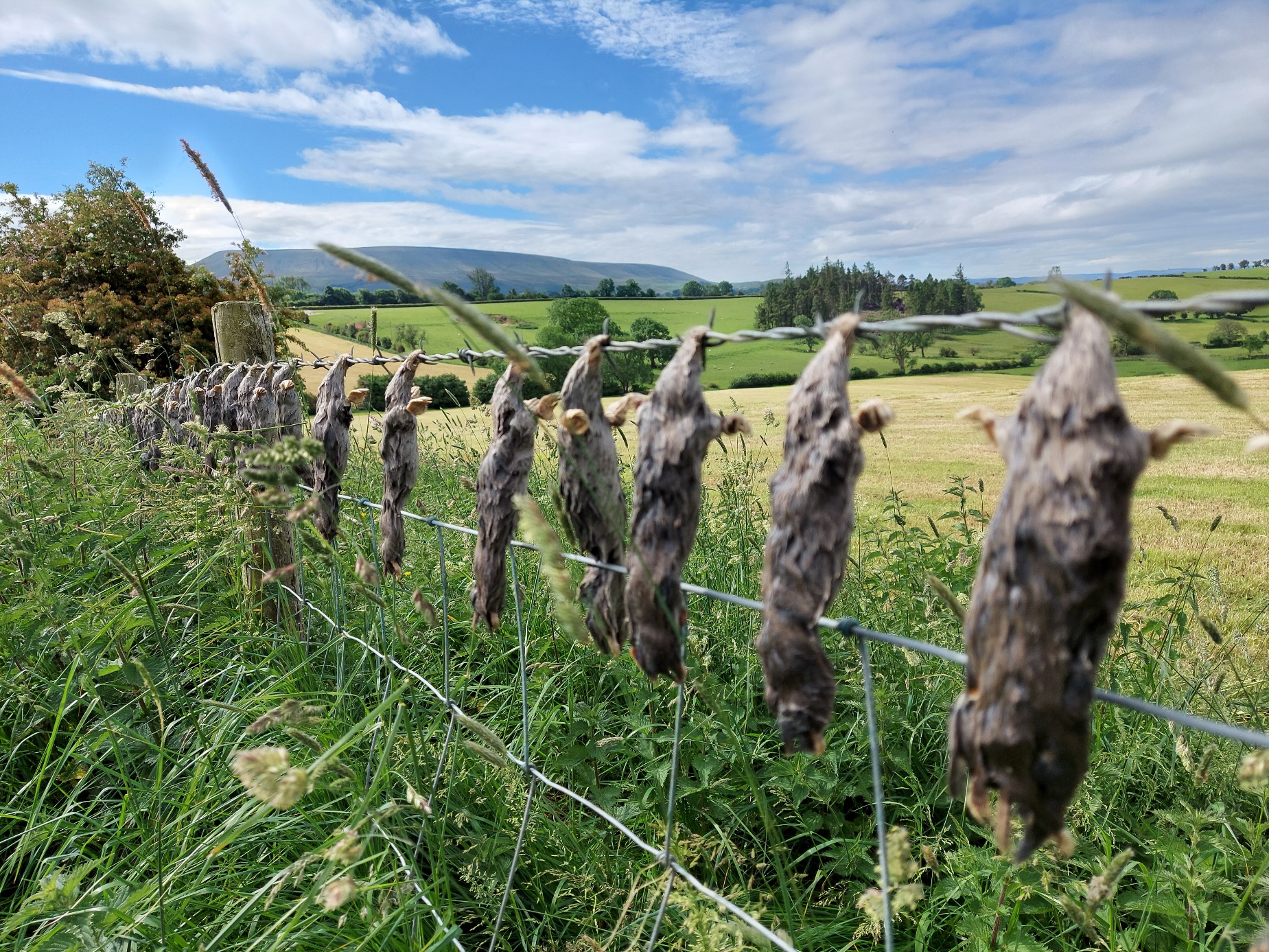 We walked past some woods signed as private with a big sign reading “Toil Trees”, and at one entrance there was a signpost which had been covered with a now-tattered cloth. There were little buildings which indicated that it might have been used for camping or activities but had been abandoned, it was sort of creepy. (Update: It took a bit of digging online to find out that this is the site of the Beat-Herder Festival and not a kill room for hikers.) Then we got to the gate leading out and there were a shit tonne of dead moles that had been fastened to the fucking fence by their faces. What. The. Actual. Fuck. It was beyond weird.