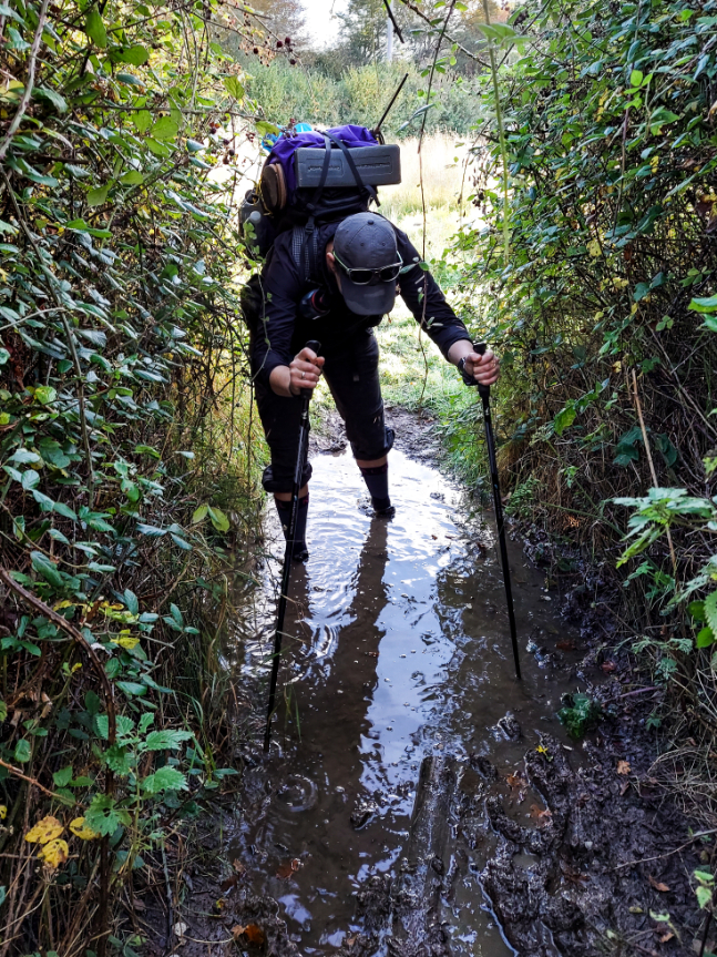 Today was meant to be a short day but it was slow going through the mud, you have to be so careful with each step so you don’t slip and end up face down, neck deep in the shit. It’s exhausting. Add to that the fact that this section was probably the least maintained and it wasn’t waymarked as well as it had been. We wandered off on tangents a couple of times, nearly lost an eyeball to errant brambles, and ran nettle gauntlets hell bent on replacing all of our blood with… whatever the shit is that stings you. At one point the trail completely disappeared and we just had to trudge through ploughed fields, following the right of way marked on our digital maps as best we could. We’d been forewarned by a bloke jogging by that this would be the case, apparently thr farmer “isn’t very good” at maintaining the footpaths that cross his land.